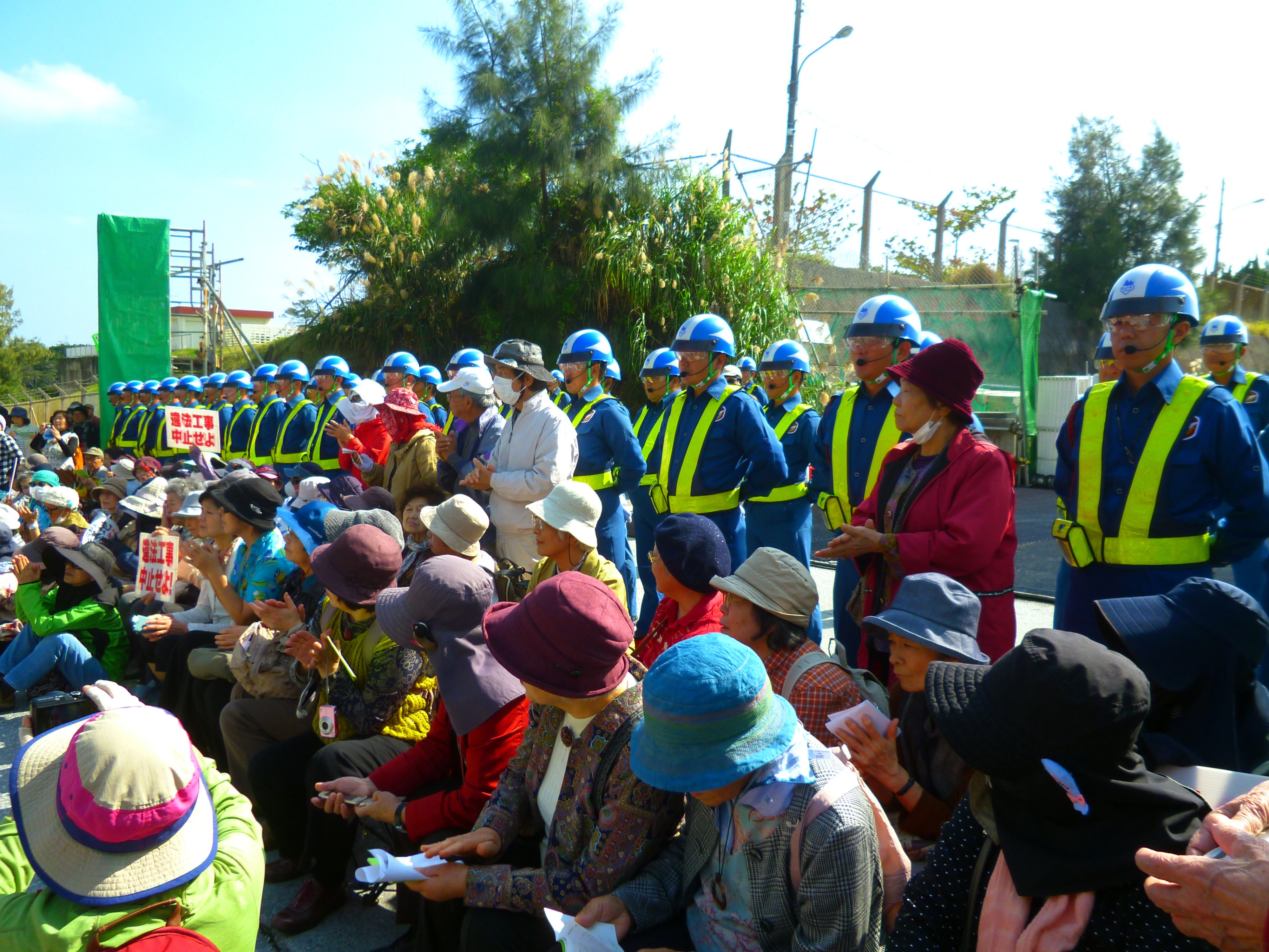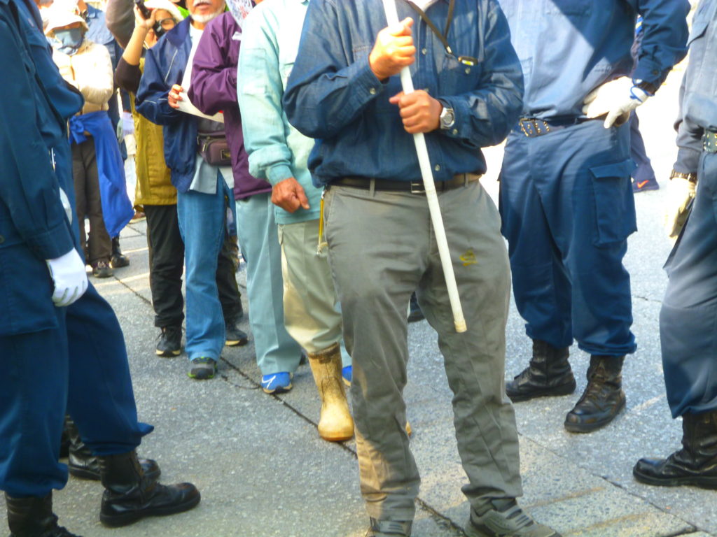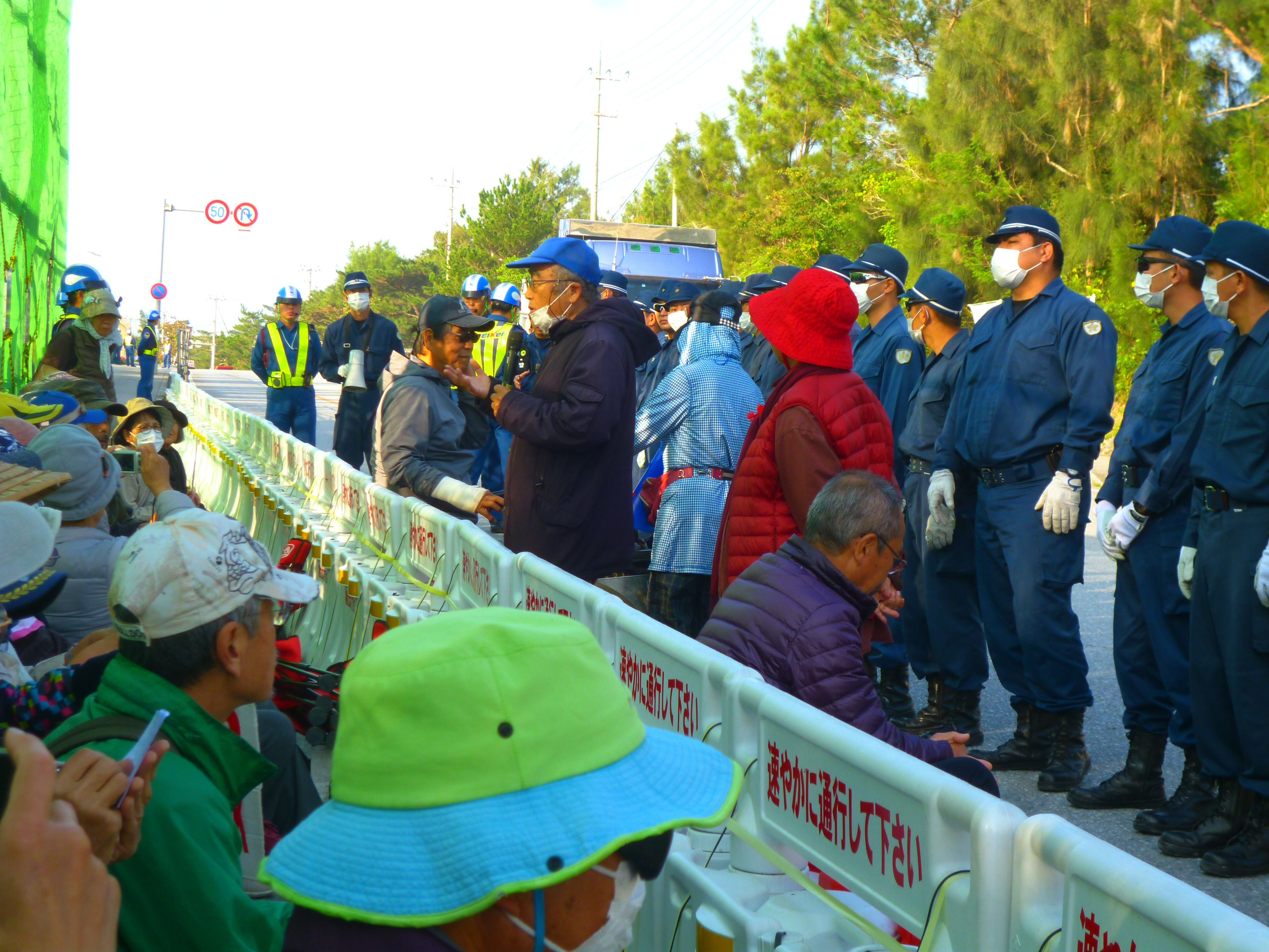 ミキサー車やダンプが入った後は、民間警備員と機動隊に挟まれながら牛歩戦術でゲート前を行進。
