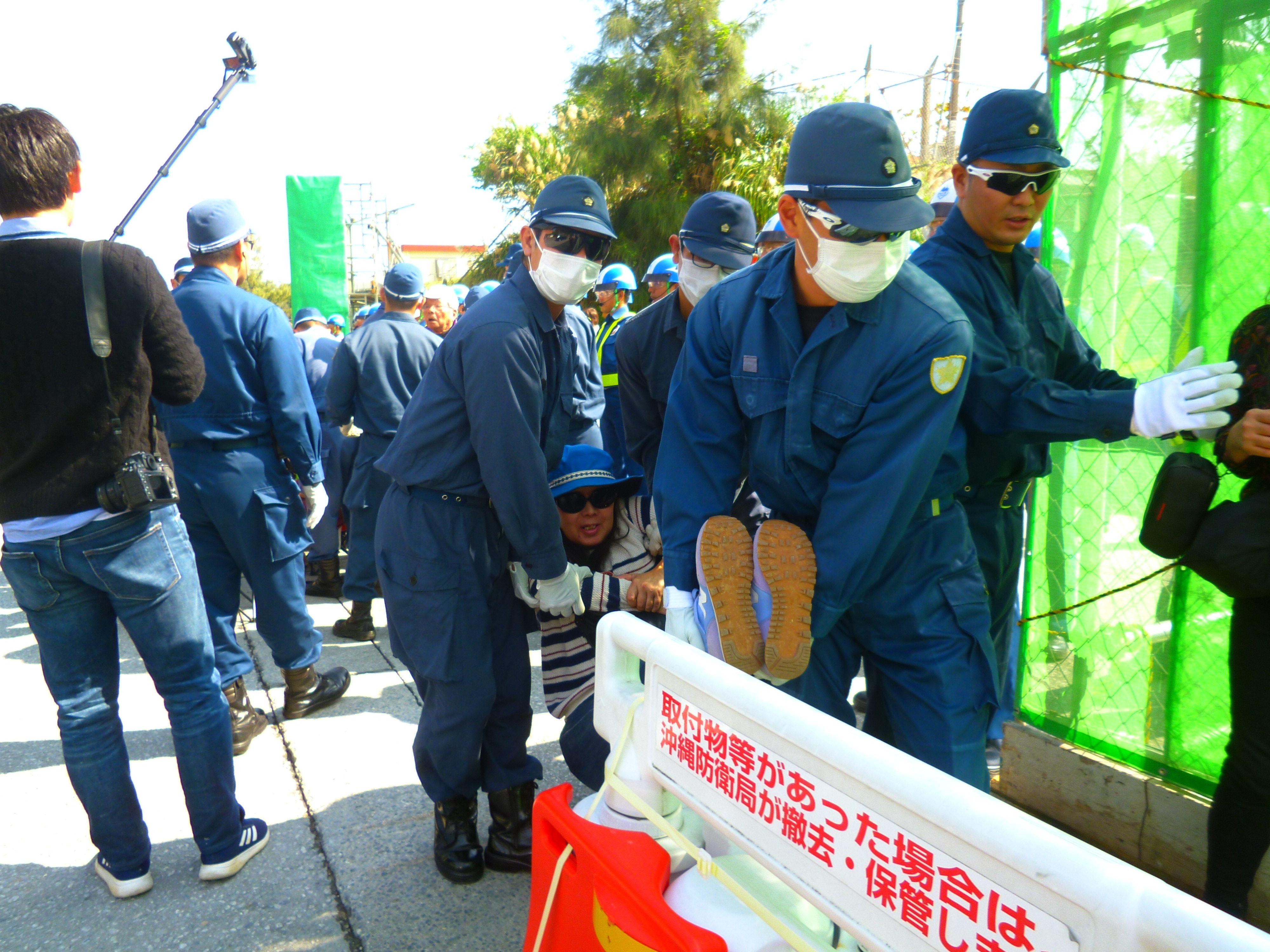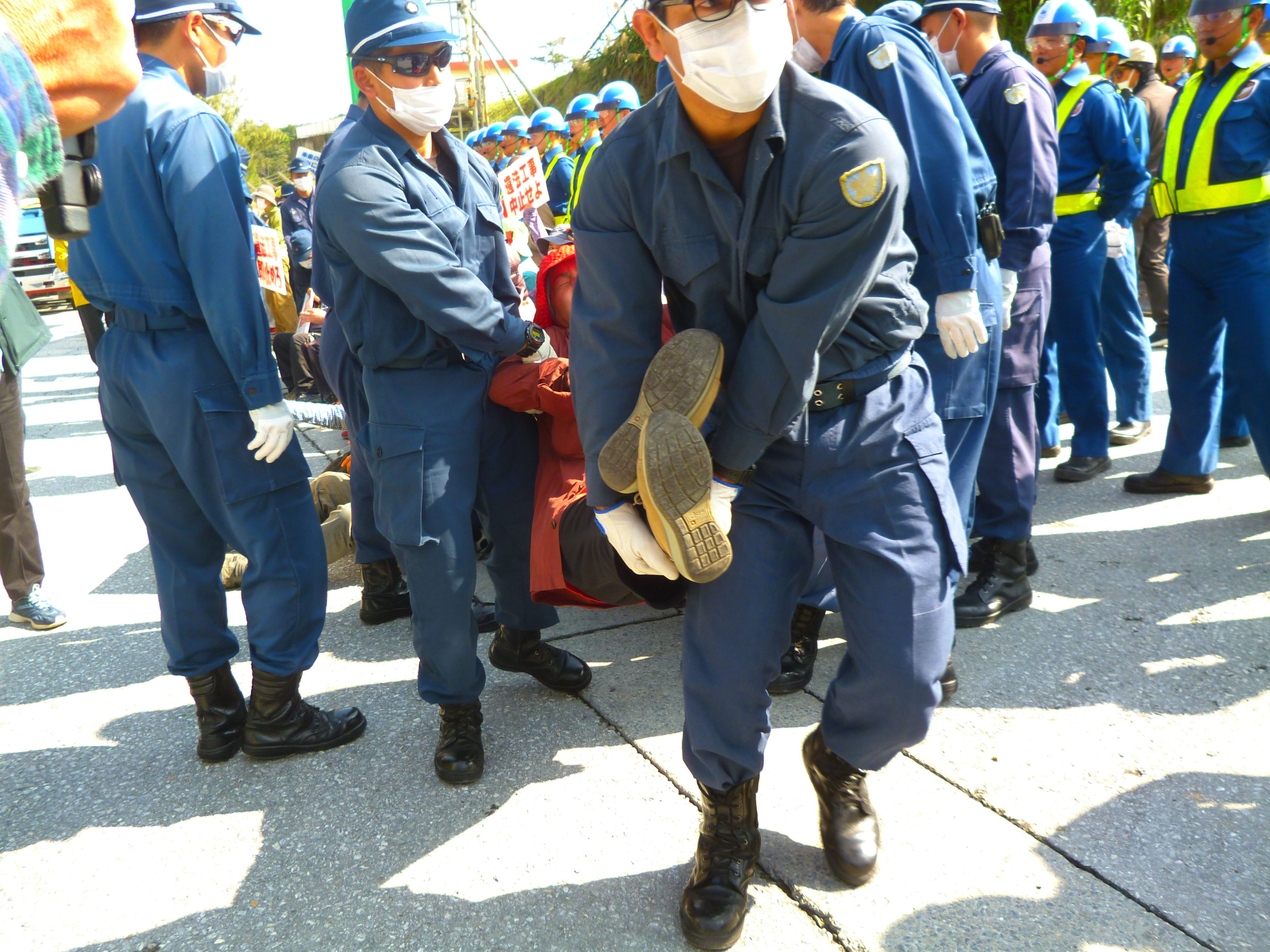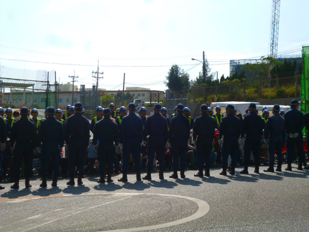 ミキサー車やダンプが入った後は、民間警備員と機動隊に挟まれながら牛歩戦術でゲート前を行進。