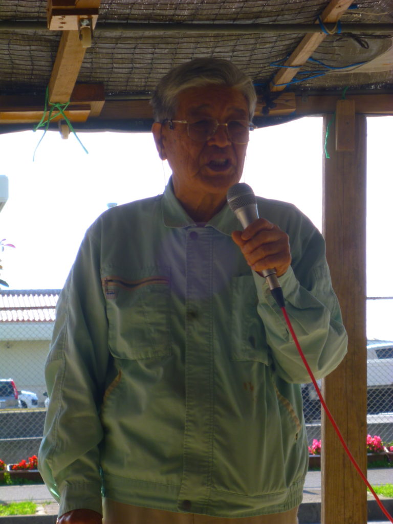 休憩時間に名護市議の大城敬人さんが、前日(21日)に行われた外務省沖縄事務所副所長が現場視察と久辺3区の住民と意見交換した様子を報告した。「まず現場を見ろ!と、名護市議会で何度も要請してきたが、やっと実現した。国立高専の屋上から、キャンプシュワブの騒音や実弾演習の射撃音、廃棄弾の爆破音、民家上空の低空飛行するオスプレイや大型機など実態を見てもらい、住民と意見交換をした」