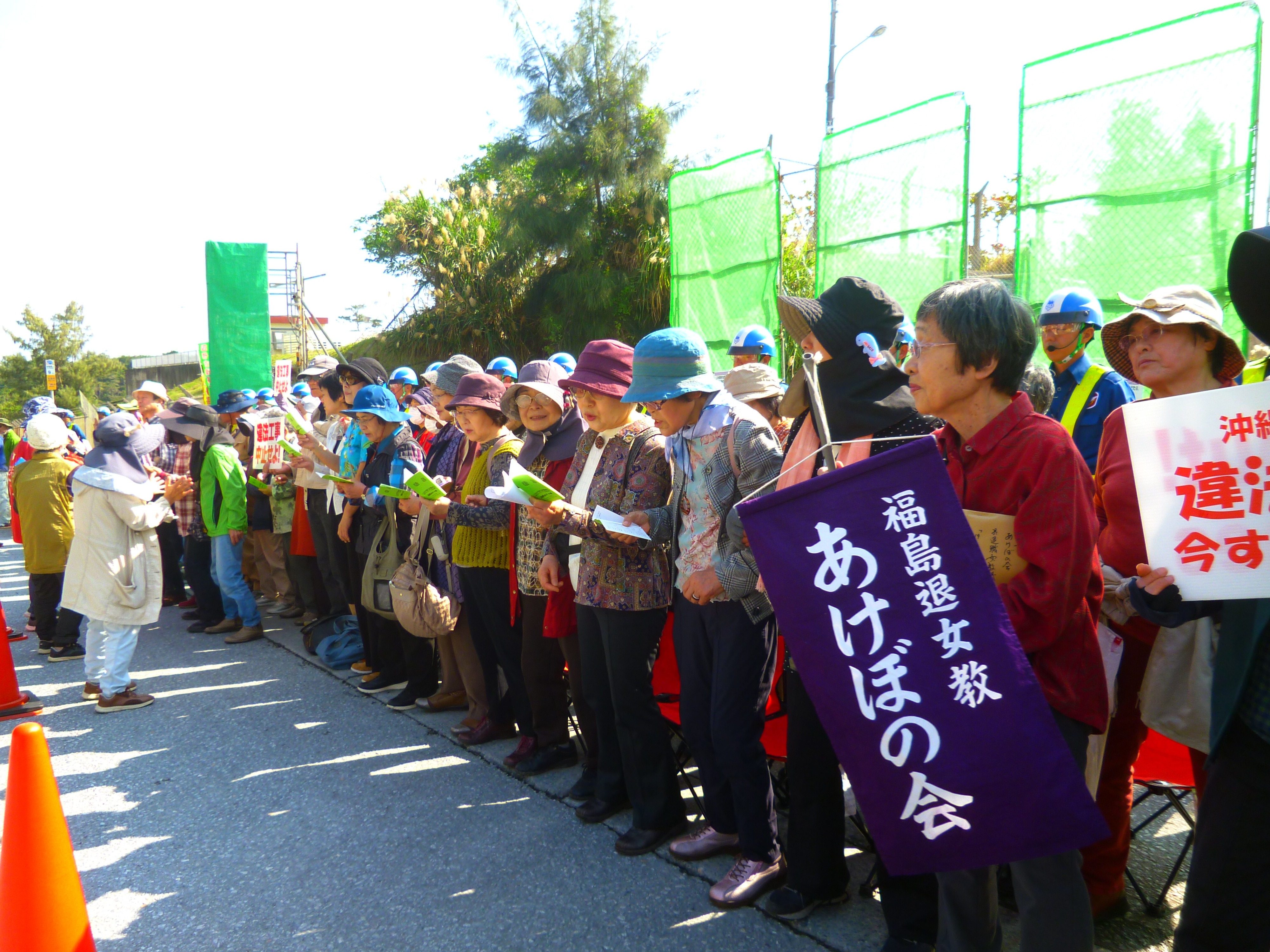 11時過ぎに福島から退職女教師の会の沖縄平和ツアーのメンバー35人がゲート前に。「実際に現場を見て、聞いていたこととはあまりに違うことに驚いている。福島では沖縄の情報はなかなか届かない。沖縄へも福島の真の情報は伝わっていないと思う。あきらめないで闘い続ける沖縄に学び、福島での闘いに活かしていきたい」とあいさつした。