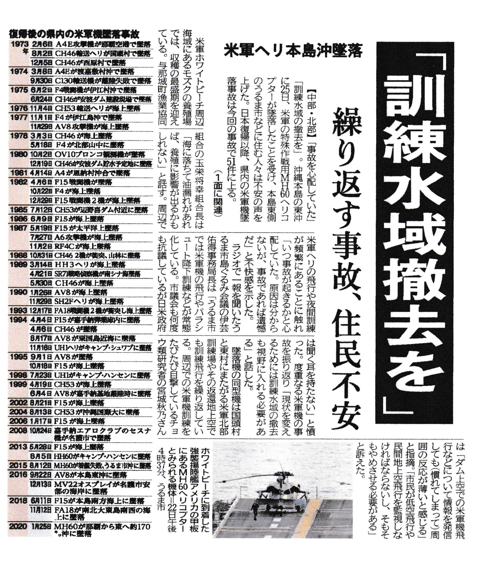 米軍ヘリ 沖縄本島沖に墜落 昨日(25日)沖縄本島の東沖に米軍のヘリコプターが墜落。NHKは着水と報道した。 <1月26日 琉球新報> 沖縄~平和のメッセージ 2020年1月26日unaiリンクURL この記事を共有する → Tweet Pin It