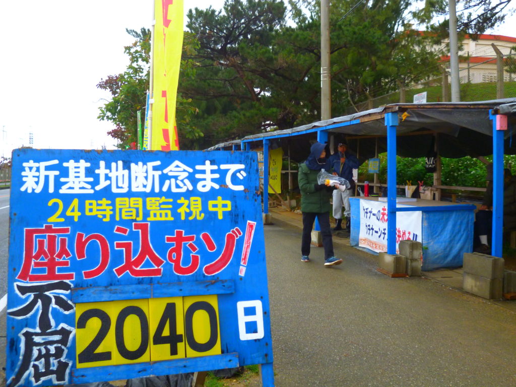 防寒と雨具で、まるでだるまさんのように膨れあがった身体をお互いに笑い合いながら、ゲート前に座り込んだ。不屈の座り込み2040日目の辺野古。
