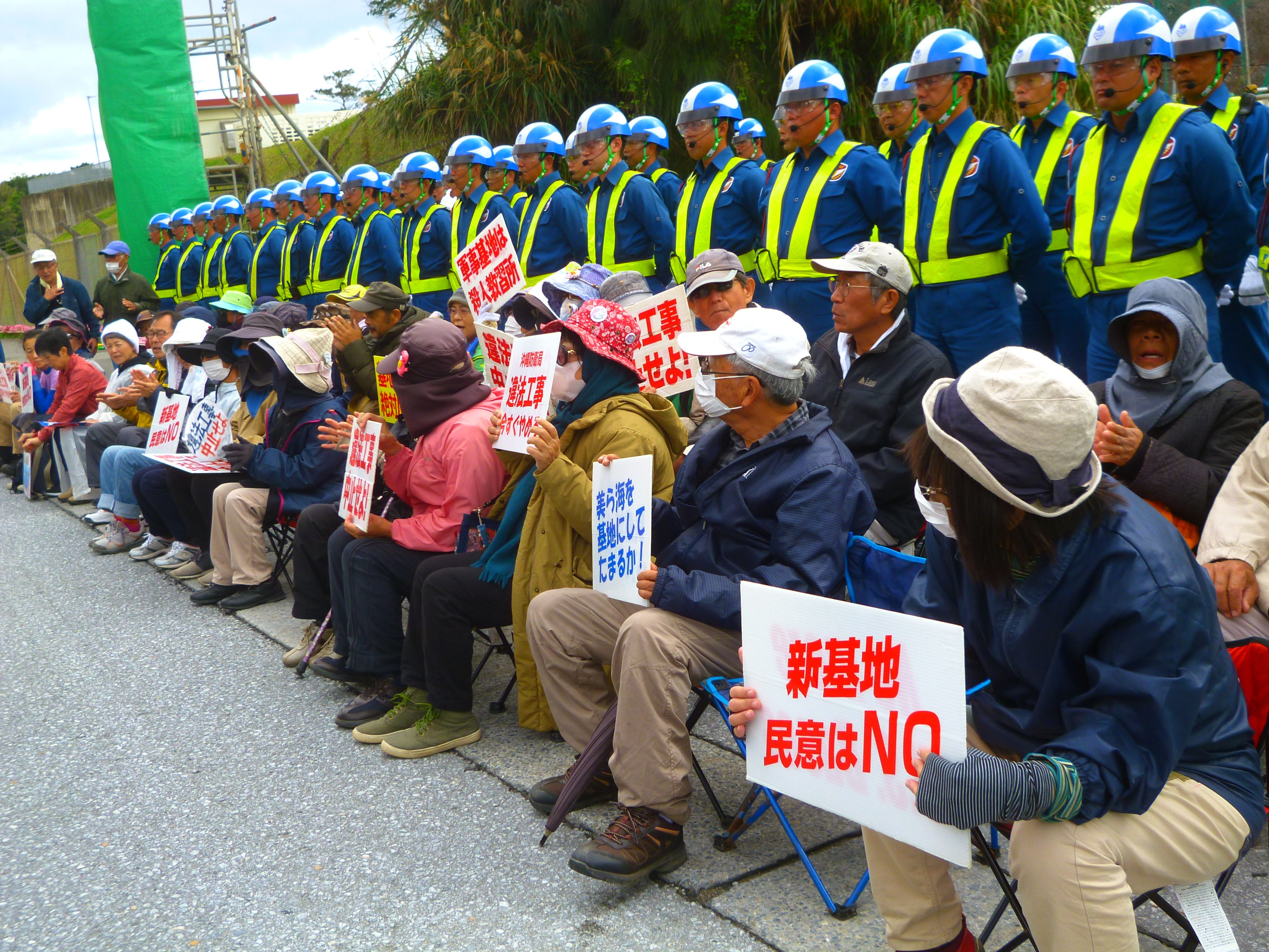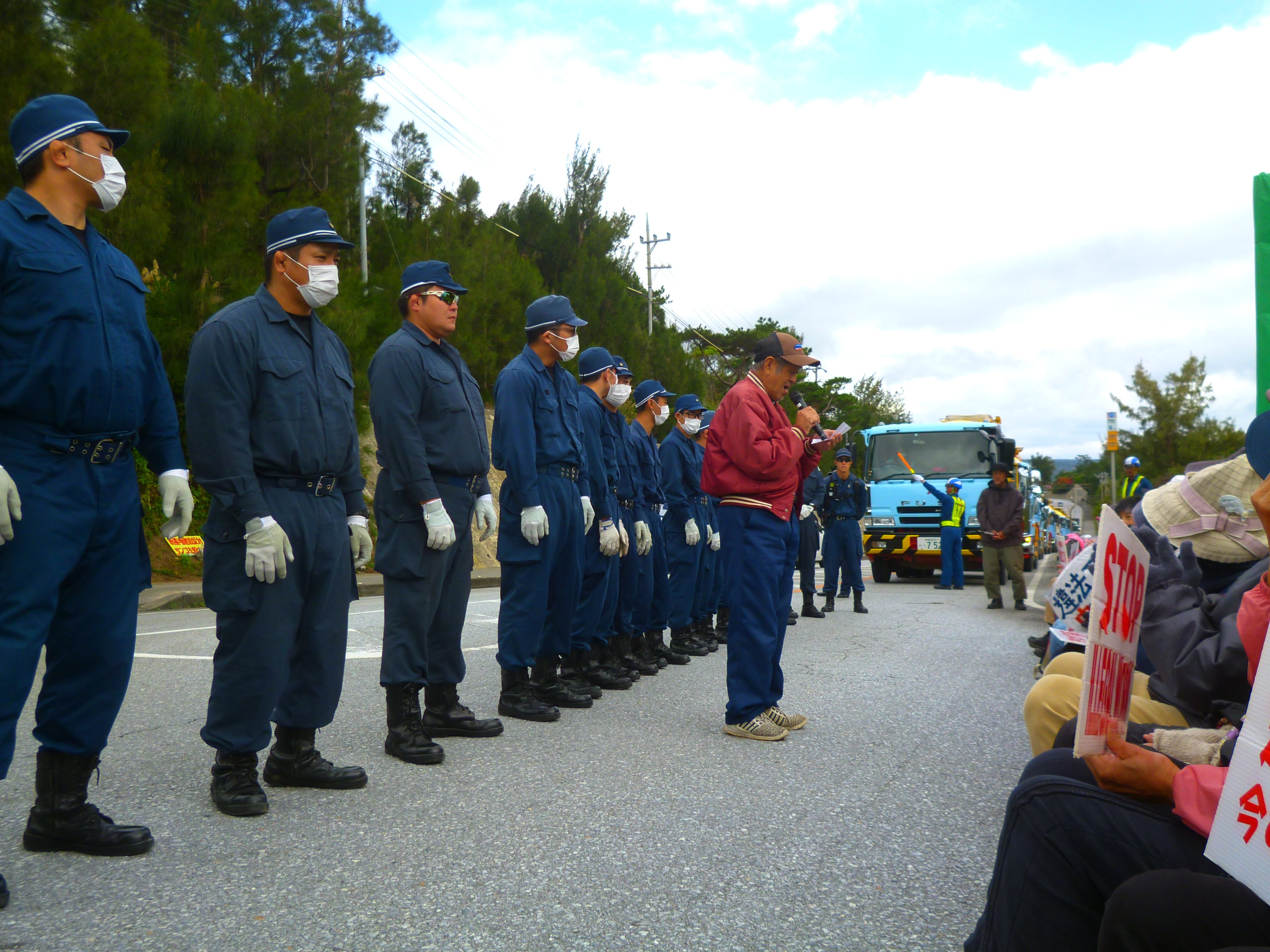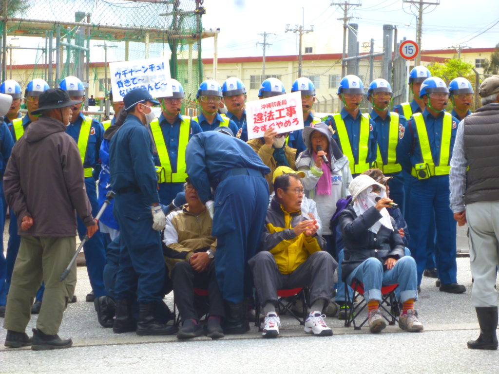 今日は午後1時半から、軟弱地盤の情報公開をめぐって、市民が訴えた裁判の証人尋問が那覇地裁行われるため、裁判傍聴にも人が割かれて人数が少なそうだと思ったら、一回目の搬入が始まる9時までには、およそ40人が集まり、座り込んだ。