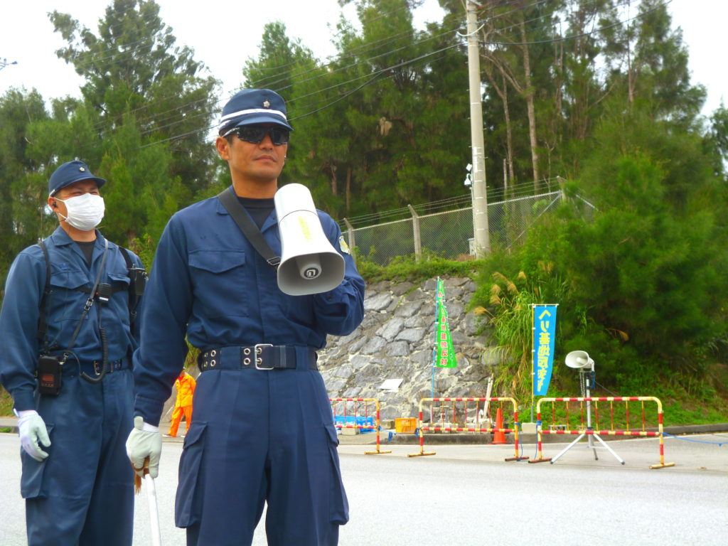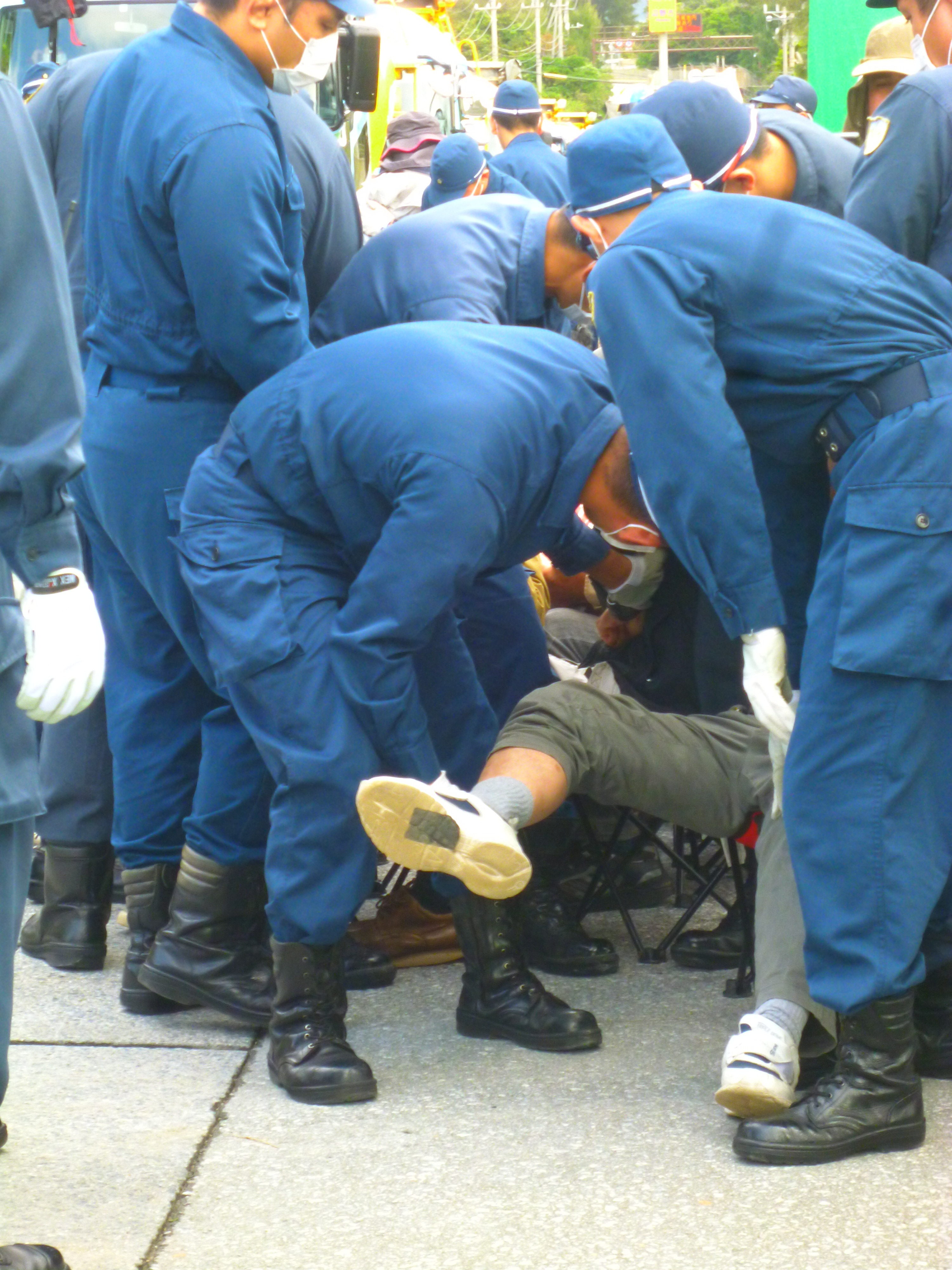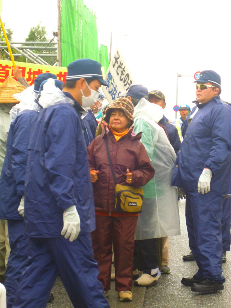 牛歩戦術でゲート前をゆっくりとデモっていたら、機動隊の挟み撃ちに会い、急いで歩くよううながされる。「ここをゆっくり歩くのも私たちの権利です!」