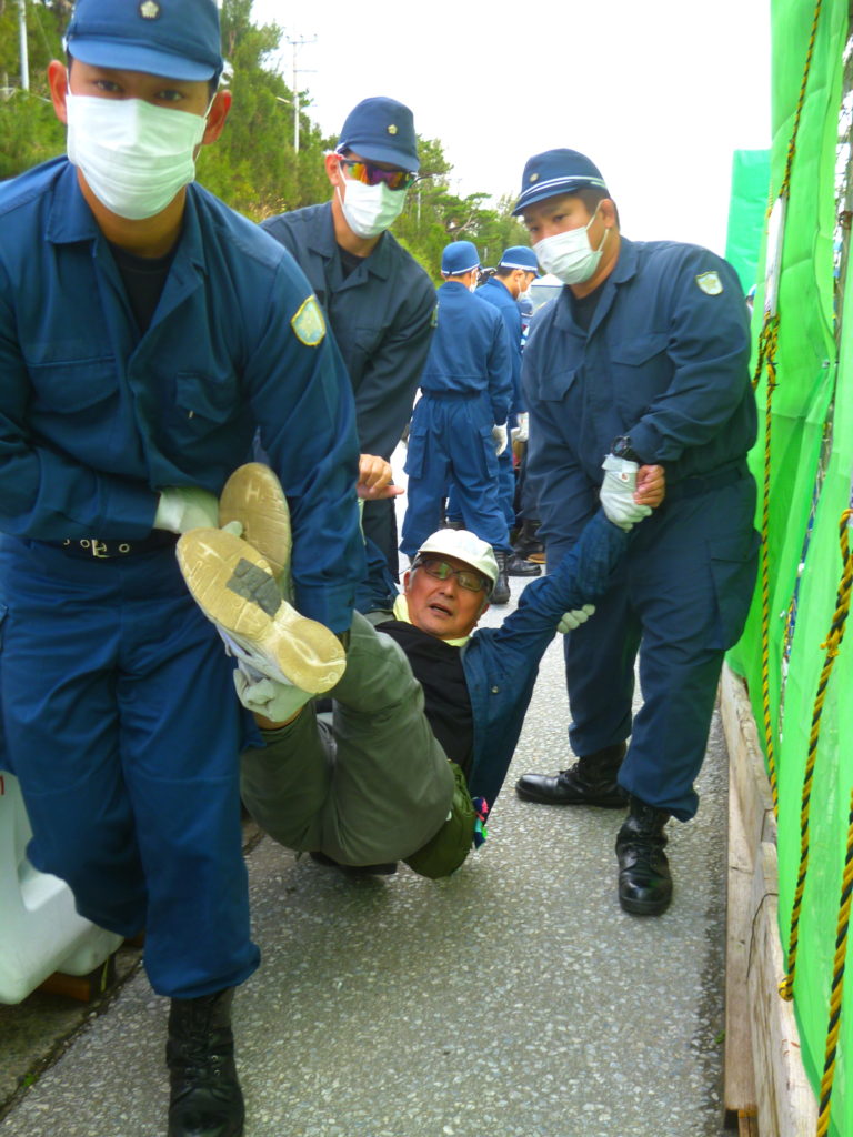 辺野古では「歌」も大切な抵抗の手段。次々と自作の「辺野古抵抗の歌」が飛び出す。歌が終わるまで、機動隊も手が出せない。「かかれ!」の合図を出しかねている機動隊の隊長。歌と歌の隙間を狙って襲い掛かる機動隊。