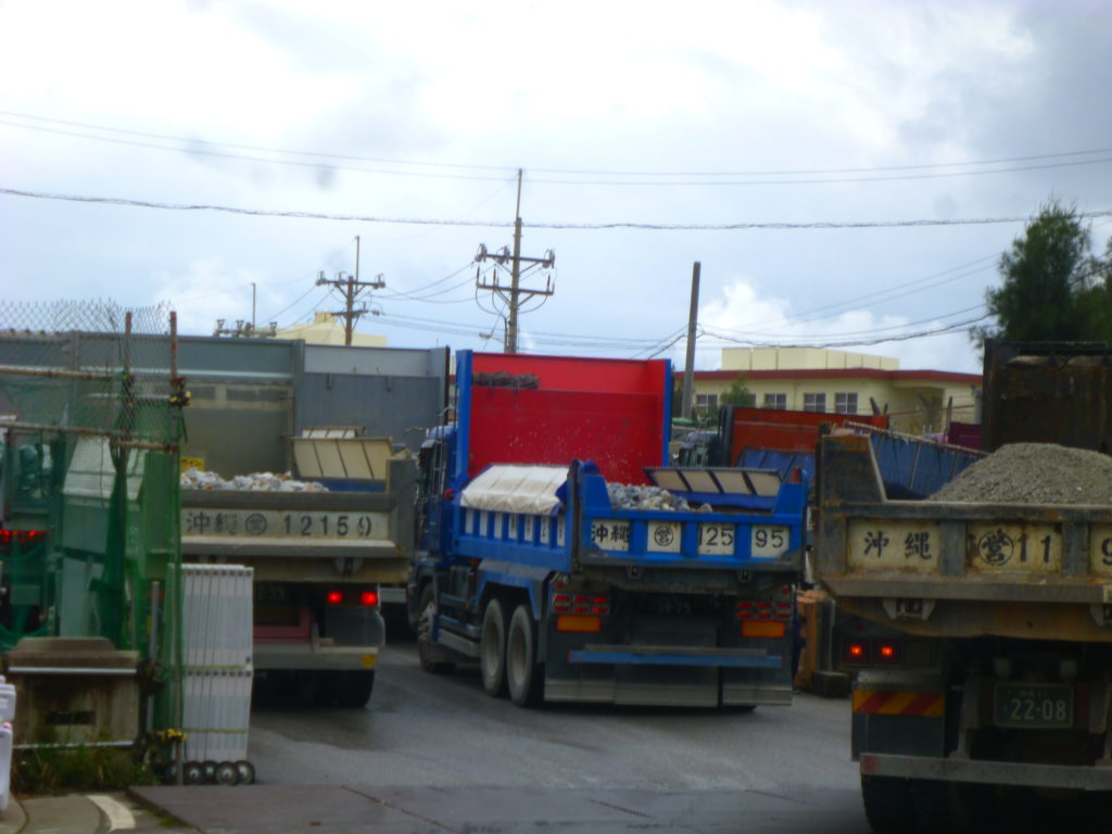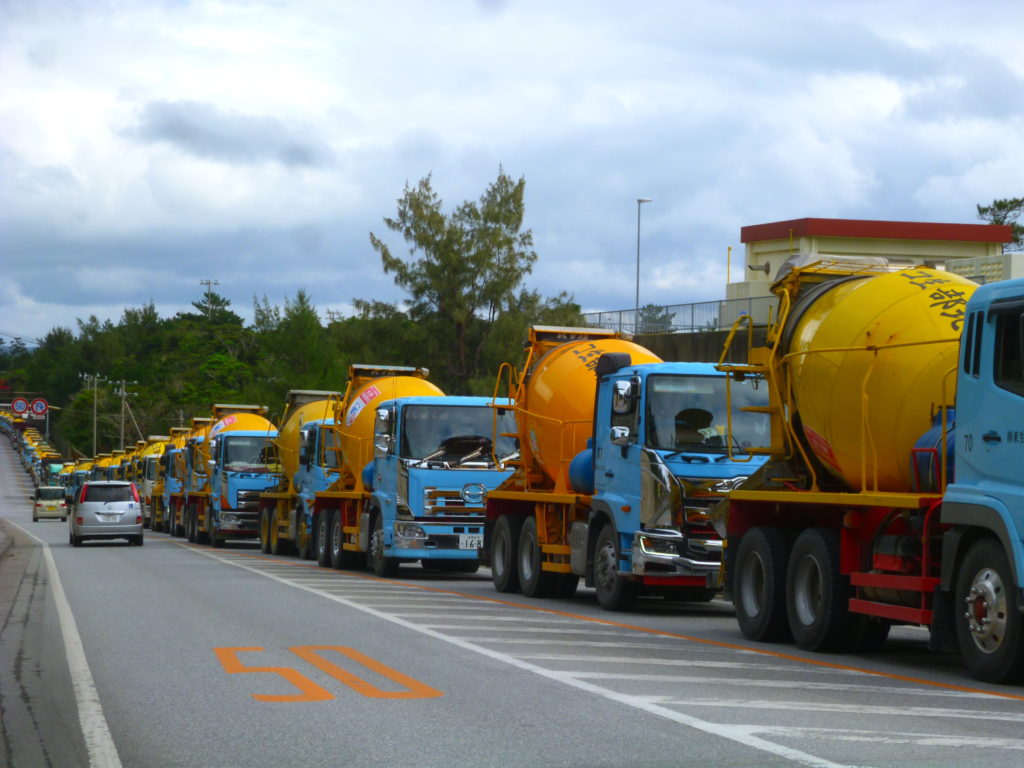 コンクリートミキサー車の他に、砂利や砂を運ぶダンプも多く、基地の中で渋滞を起こしていた。