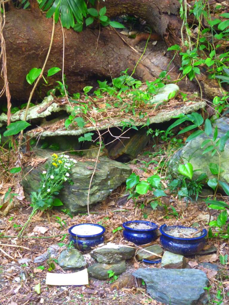 我が家ではまず、一族の始祖が眠っていると言われている「ウル墓」にお参りします。お墓とは言っても、それらしい建造物はなく、大きなテーブル珊瑚が2枚、重ねるように置かれているだけです(ウルとはサンゴ礁のこと)。香炉が3個あるのは、私たち以外にもここへお参りする一族があるということを示しています。