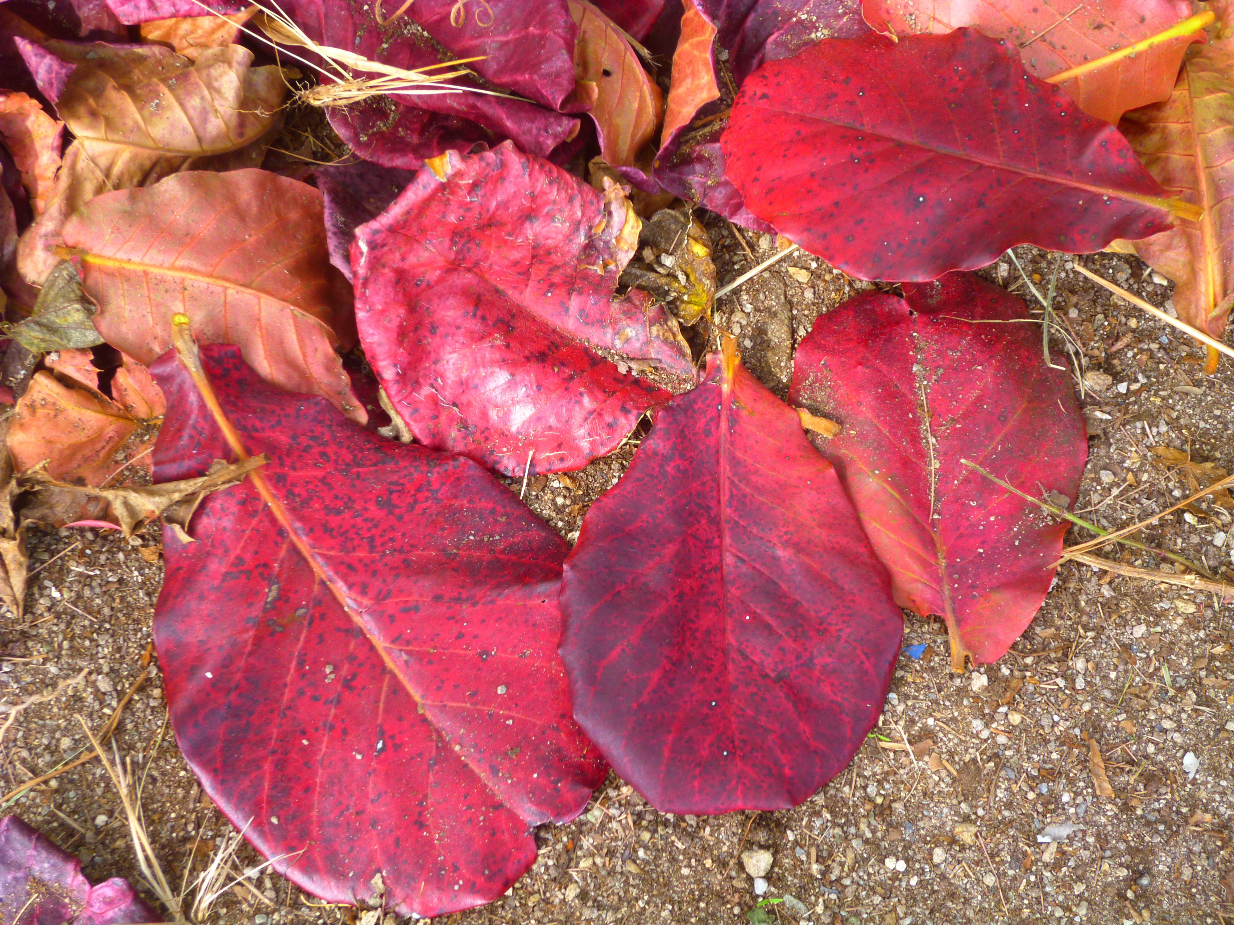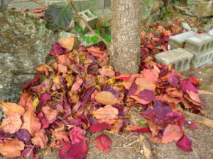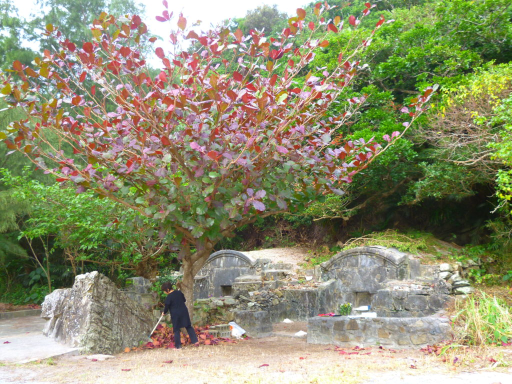 お墓の前には、紅葉し始めた大きなクワディサー(コバデイシ、モモタマナ)の木があります。沖縄では珍しく紅葉する植物の一つです。ただし秋ではなく、早春に紅葉します。