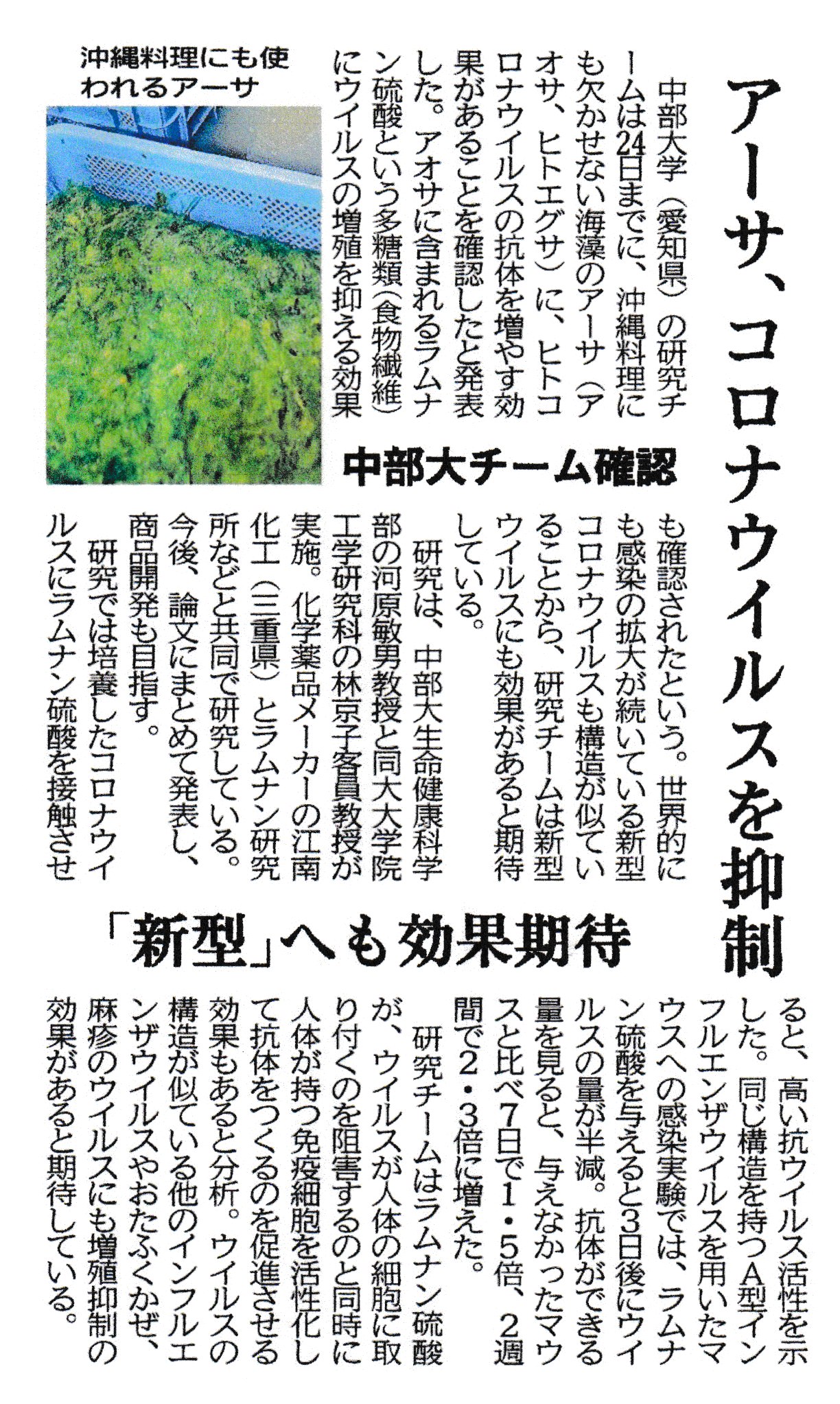 アーサを食べて新型コロナウィルスを吹き飛ばそう! 国内唯一の亜熱帯地域である沖縄は、独自の自然に恵まれ、健康食品の宝庫として知られています。いま、世界中を震撼させている新型コロナウィルスに、沖縄で豊富にとれる海草「アーサ」が有効であるという研究発表が注目されています。 沖縄では、モズクと同じようにアーサをみそ汁や吸い物にいれたり、てんぷらにしたり、酢の物にしたりして食べます。私も大好きですが、この記事のおかげて、スーパーの店頭からアーサが消えてなくならないよう祈ります。(できるだけ多くの人に行き渡るよう、くれぐれも買占めはおやめください) うちなぁ ぬちぐすい紀行, 地元新聞の記事より 2020年2月25日unaiリンクURL この記事を共有する → Tweet Pin It