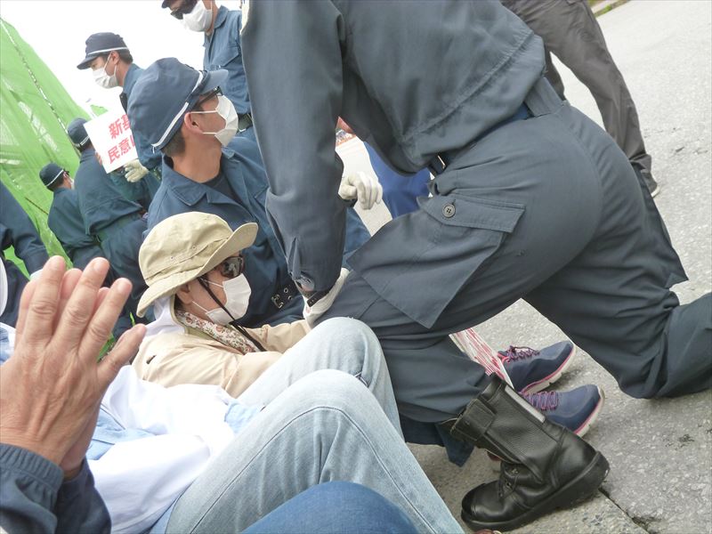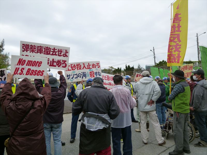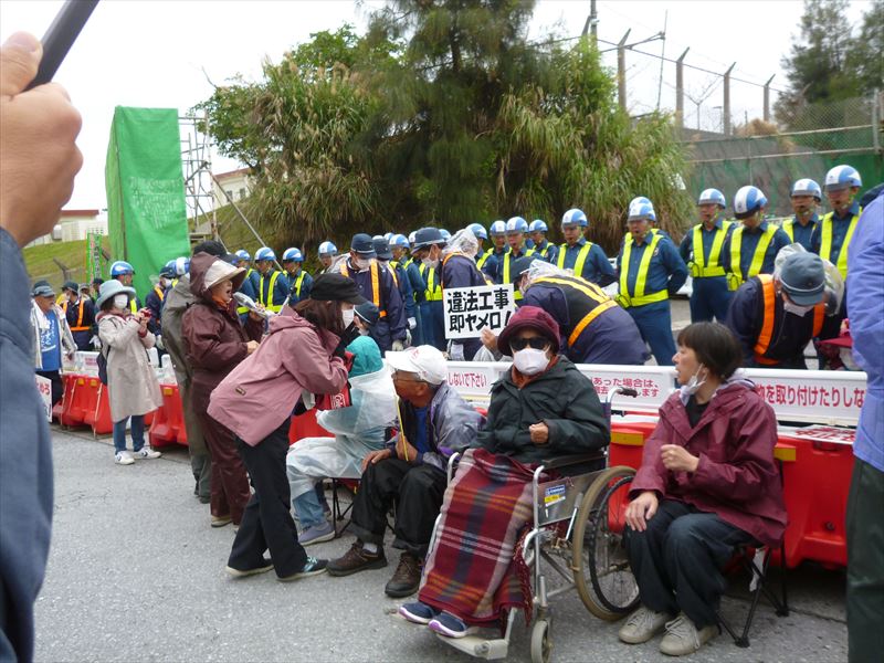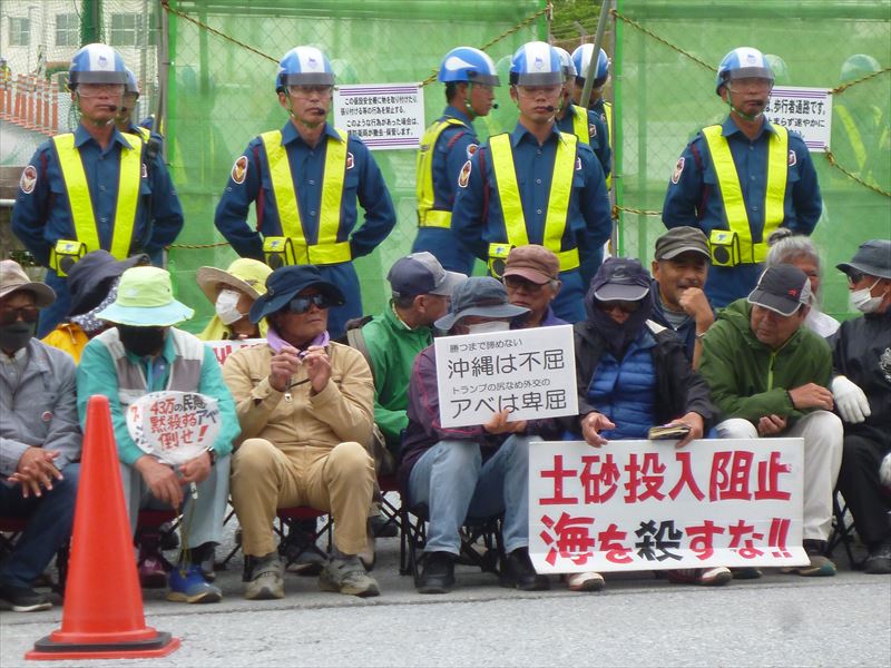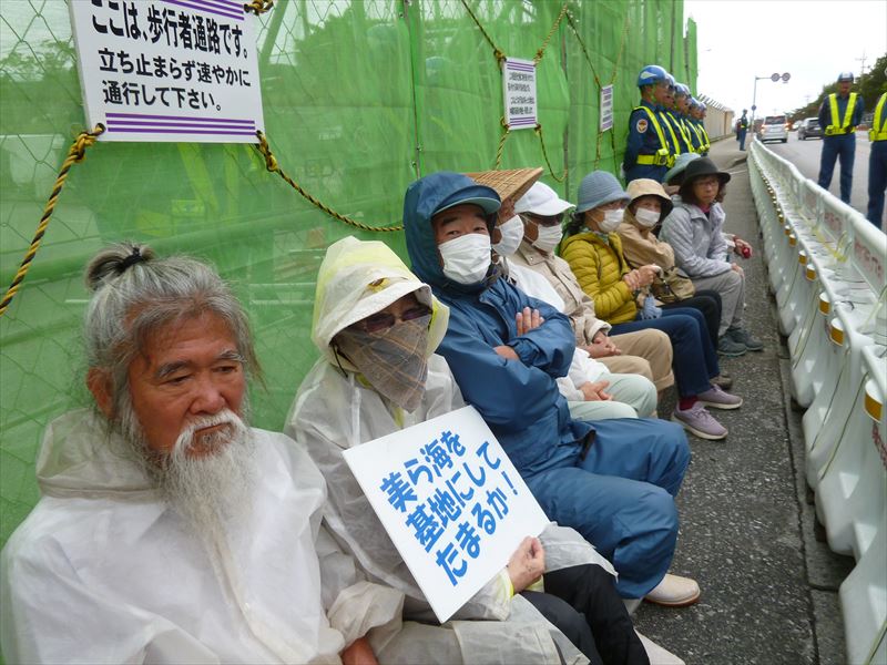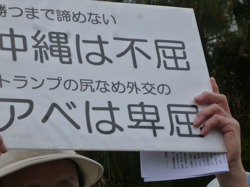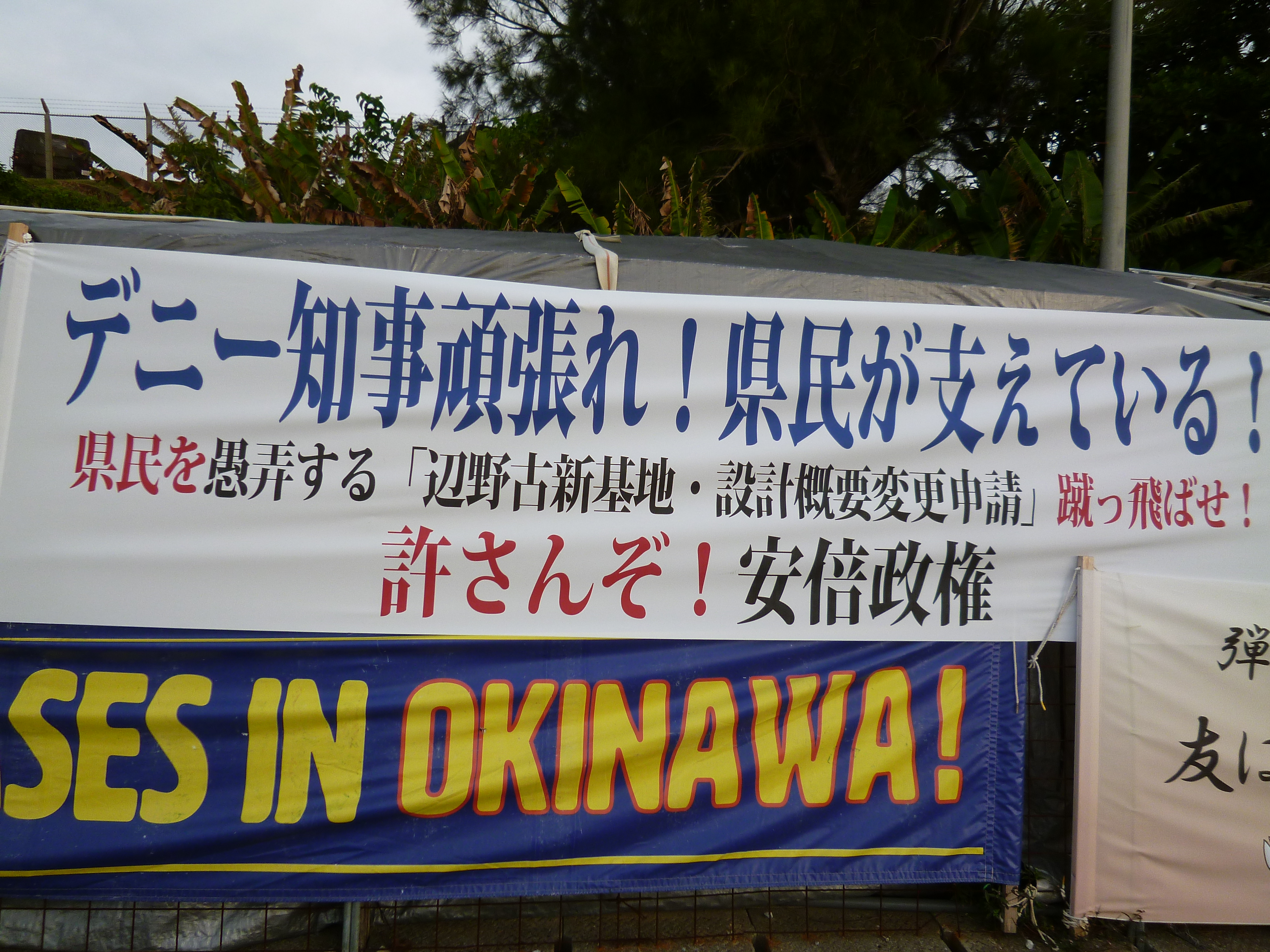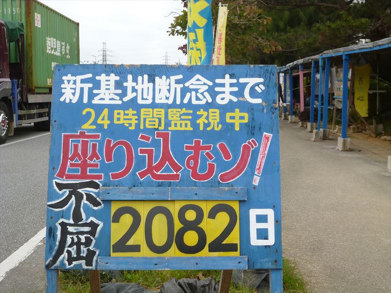 沖縄の不屈の闘いは2082日目、メインゲート前のテント横には、新しいい横幕が増えていた。