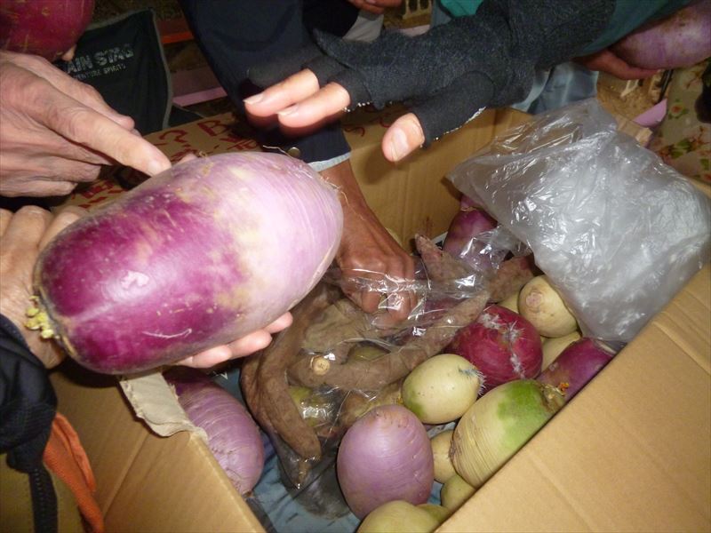 大根は紫色がとてもきれいで、それにお芋もあり、一個ずついただいた。