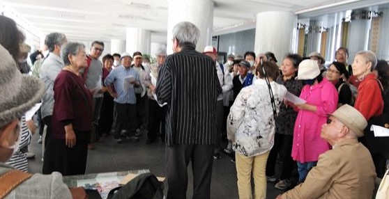 <要請行動を前に、県庁ロビーに集合した人々>