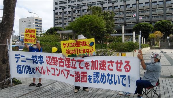 そんな中、こともあろうに琉球セメントは、臆面もなくこの3月31日で使用許可期限が切れる旧桟橋の使用期限の延長を、沖縄県に申請してきた。そんなさらに違反行為を重ねるような申請に許可など与えてはならないと抗議した。