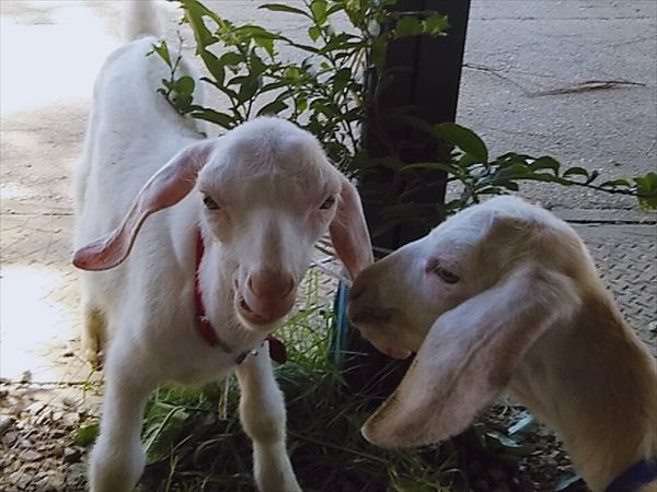 今日も子ヤギちゃんたちが慰問に来てくれた。三つ子のうち2匹が交代で、毎日ゲート前にやってくる。まだ名前はないそうだ。
