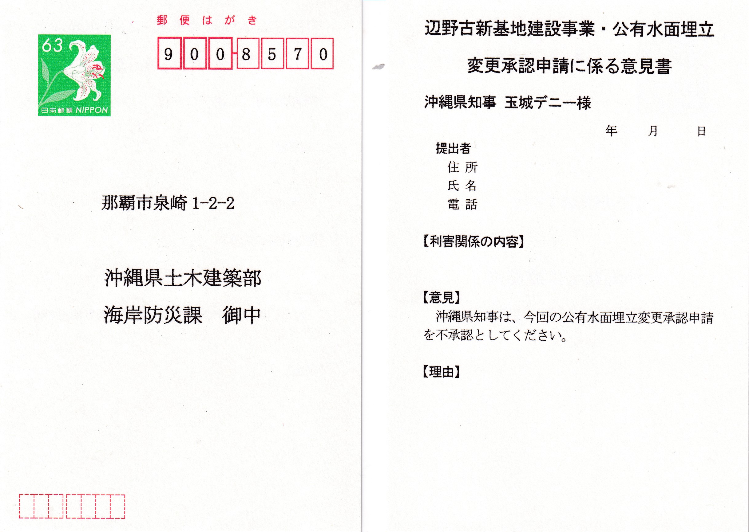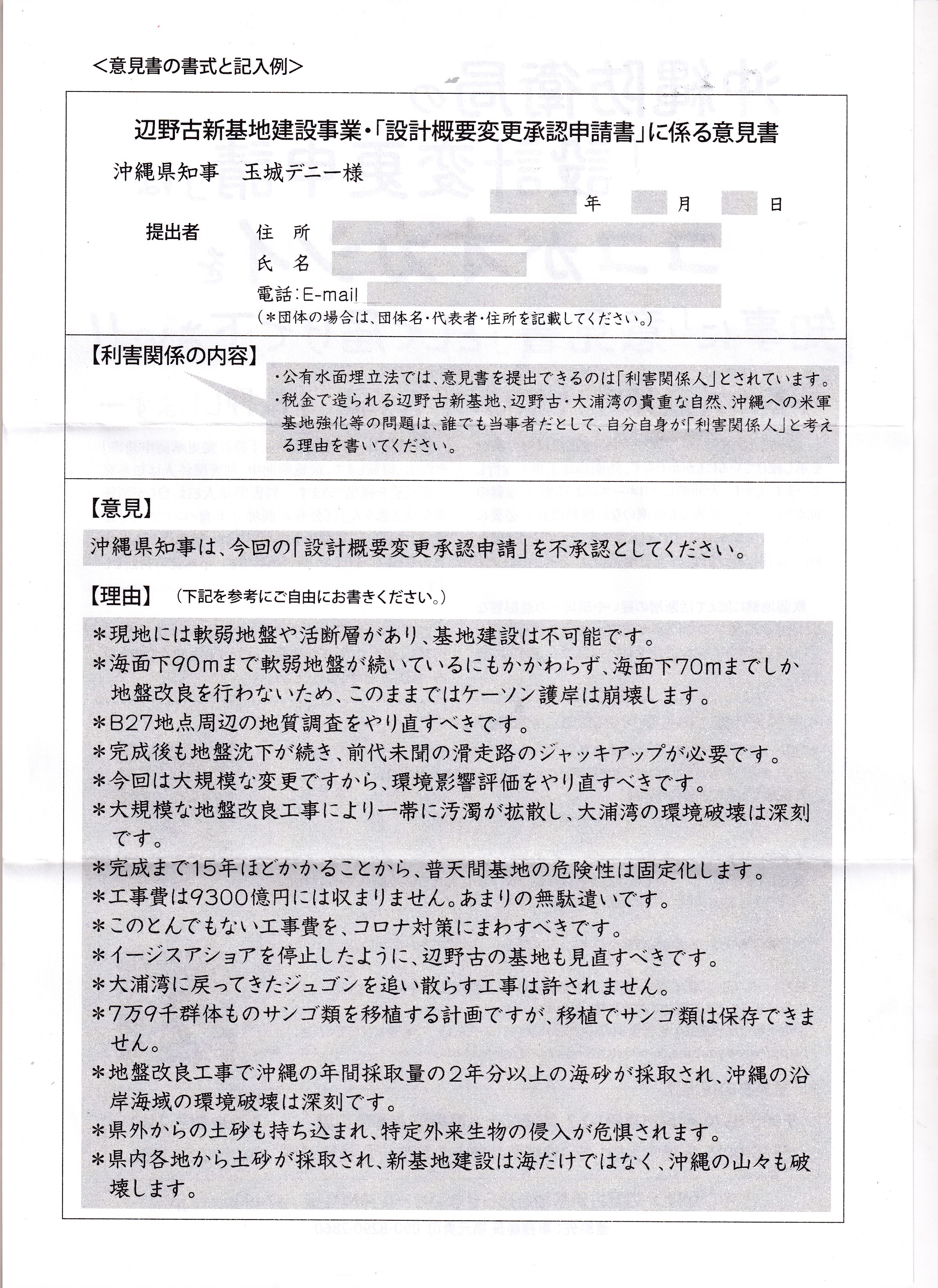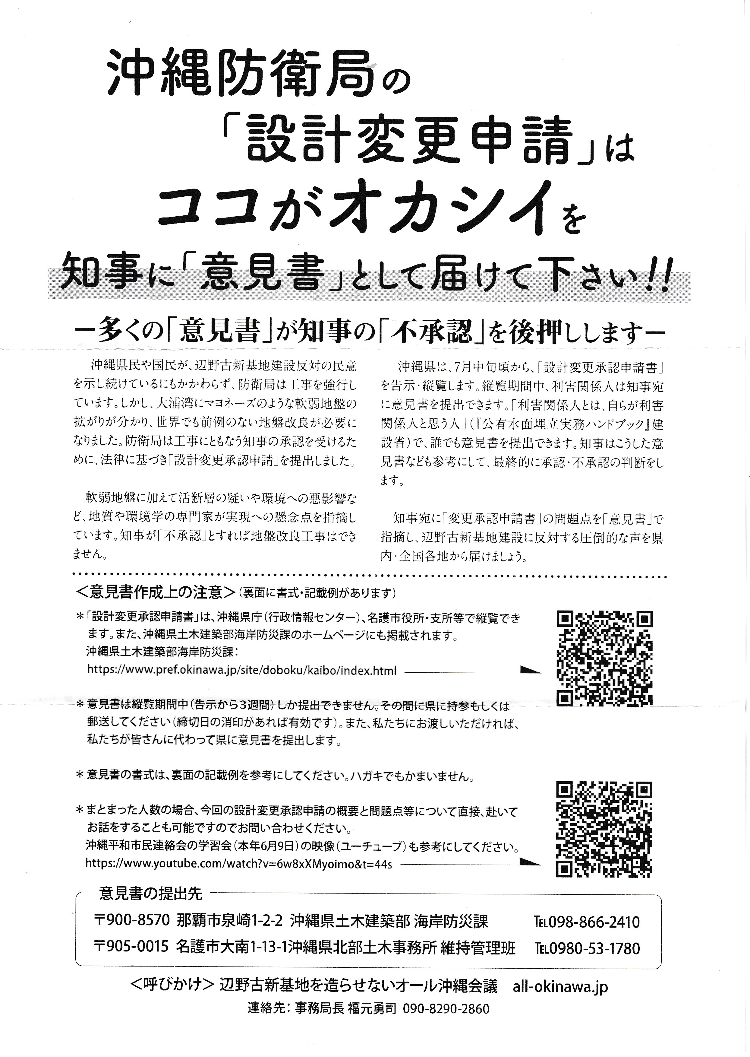 オール沖縄会議では、辺野古の新基地反対する仲間の皆さんに、設計変更反対の意見書の提出を、広く呼び掛けています。意見書は全国どこからでも提出することができます。