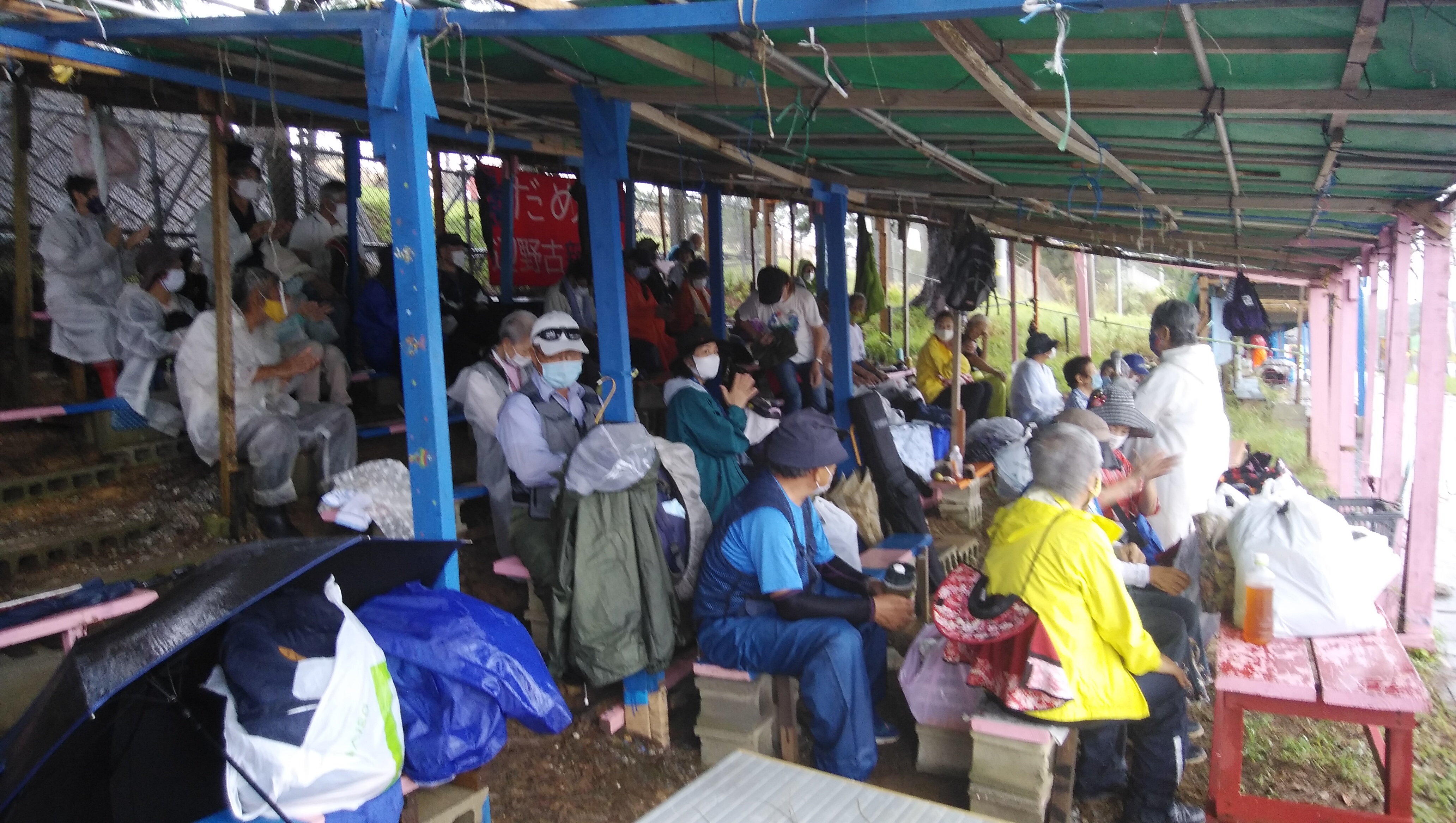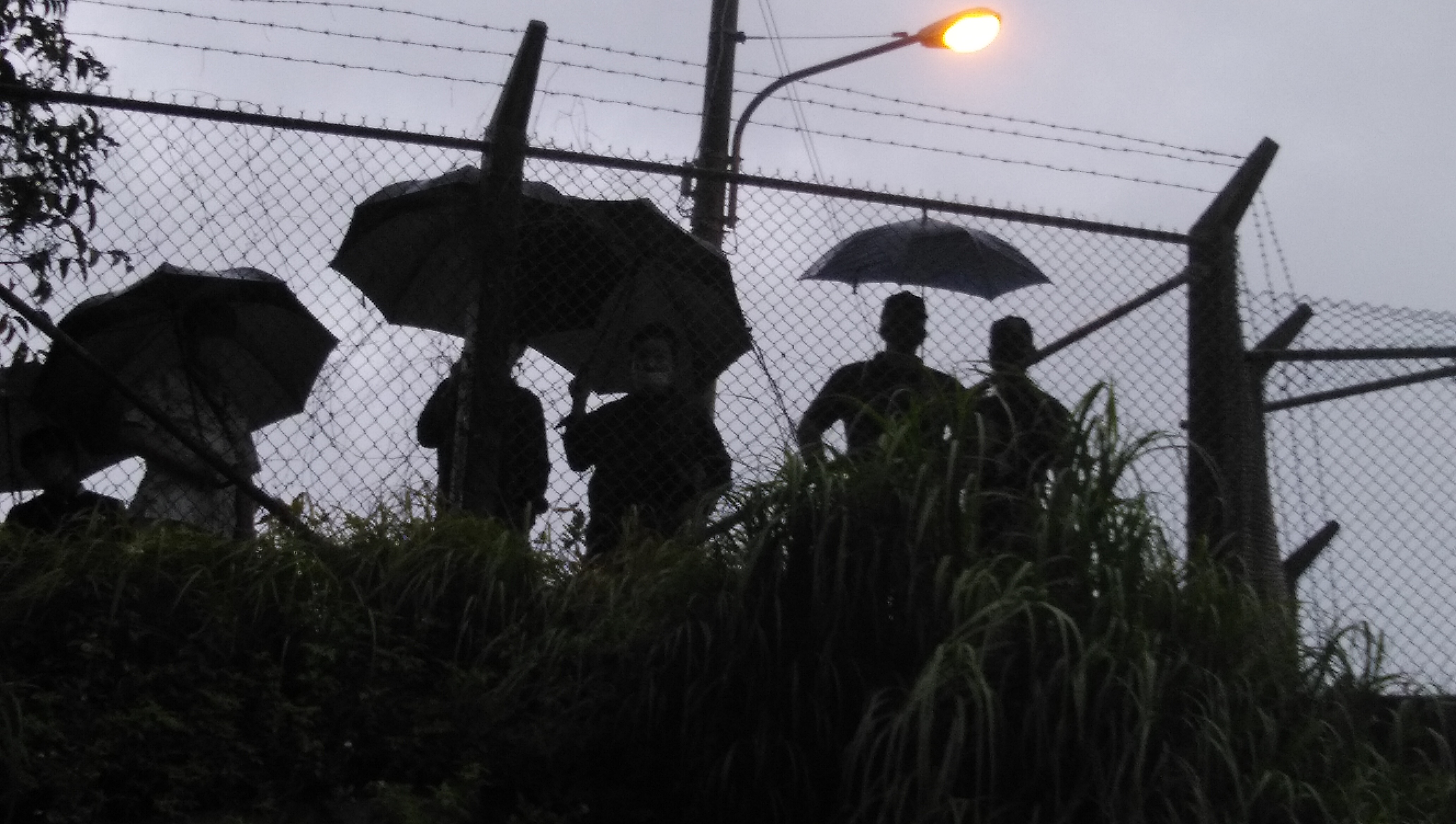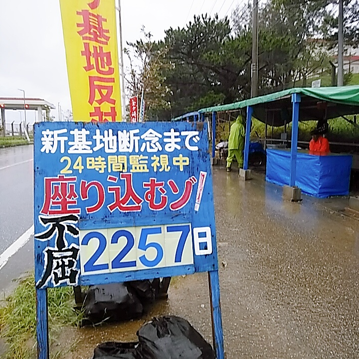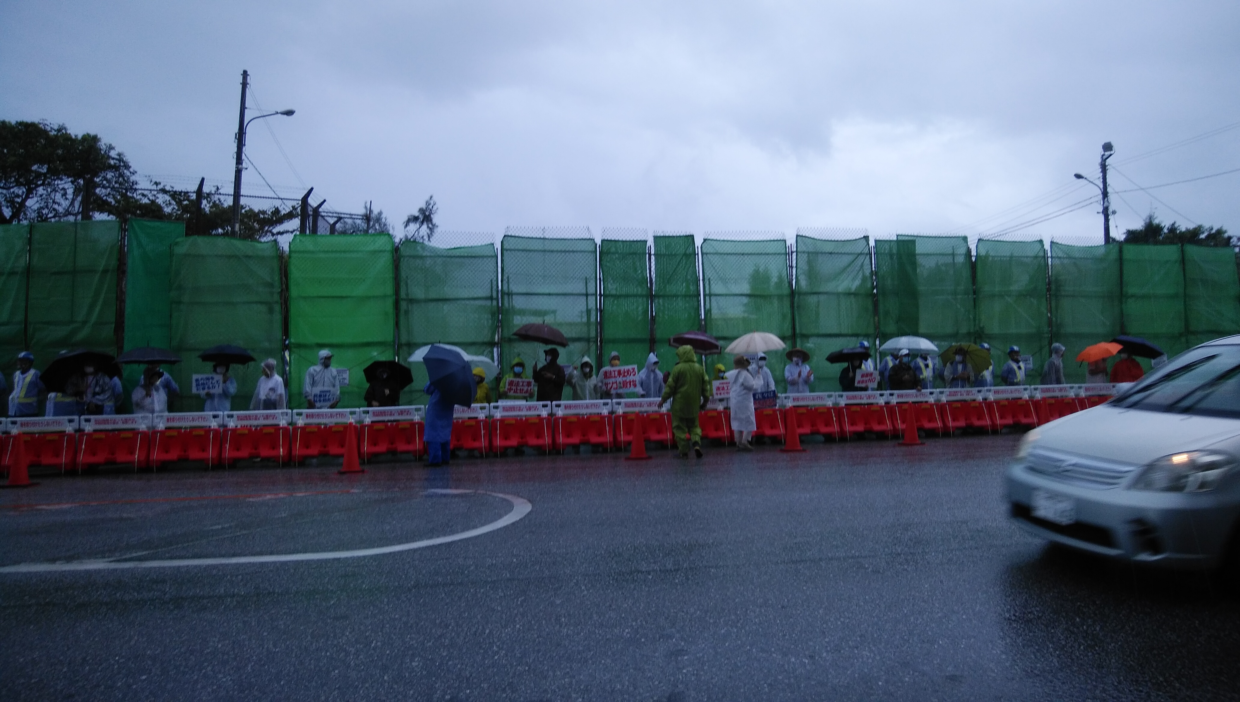 県独自のコロナ自粛規制が解け、去る月曜日から正式な抗議行動の再開3日目。土砂降りの雨の中で、9時には40人近くが座り込んだ。いや!大雨で座れず、立ったままでの「座り込み」だ。