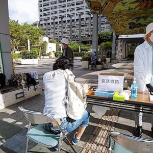 連休で沖縄を訪れたというカップルは「気になっていたが思いがけずこんなところで意見書提出ができてよかった!」と自ら駆け寄るようにしてペンを執り書き込んだ。