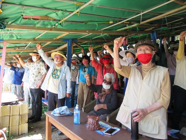 県内各島ぐるみの代表の活動報告の後、オール沖縄会議現場部会長の山城博治さんが「コロナ自粛期間中も毎日のように現場にかこつけ、県民は歯を食いしばって闘い続けている。安倍に続く新政権も狡猾で陰険だ。それでも沖縄は負けない。不屈です。頑張りましょう!」と集会を締めくくった。