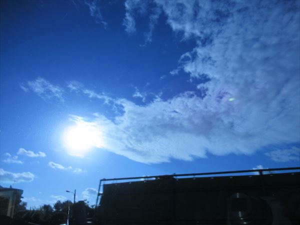 高速道路を走るバスの窓から中城湾に昇る朝日がまぶしい。衣替えした空の秋雲が、羽を広げた鳳凰のようにも、火の玉をくわえた龍のようにも見える。