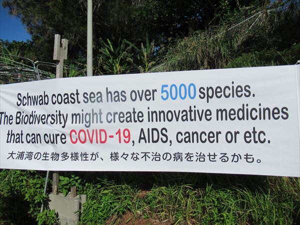 今日新しく掲げられた横幕。「大浦湾の生物多様性が、さまざまな不治の病を治せるかも!新型コロナも、エイズも、癌も、その他…」生物多様性とはそういうことなのだ。