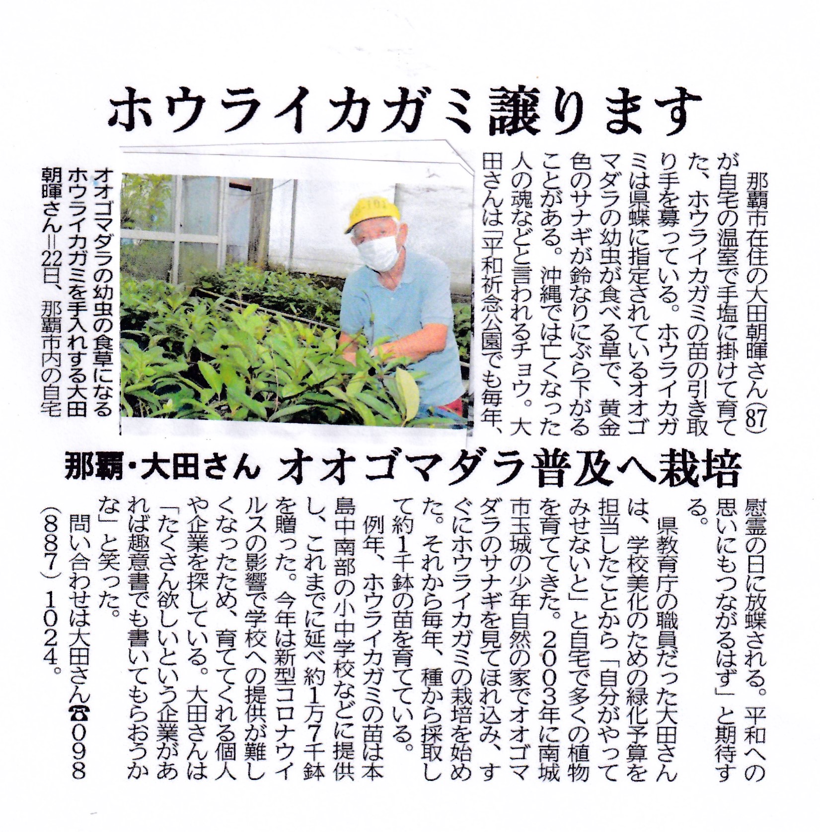 沖縄の県蝶・オオゴマダラを増やそうと、オオゴマダラの幼虫の食草となるホウライカガミの苗を育て、県内の小中学校へ配るという奇特な方がいらっしゃいます。