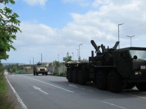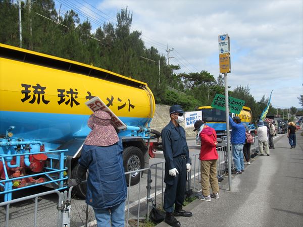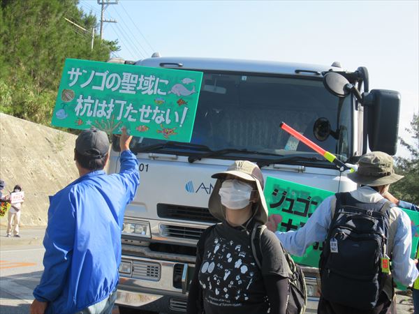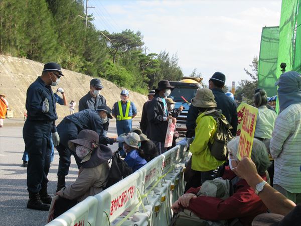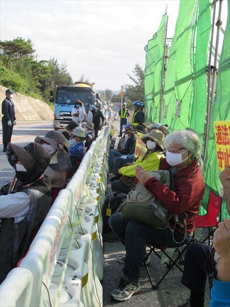 過積載だ!警察は、民間工事のダンプには、うるさいほど過積載防止の取り締まりをするが、辺野古では見て見ぬふり。ダンプも咎められないとわかっているので、居並ぶ県警機動隊の前を堂々と「道交法違反」。