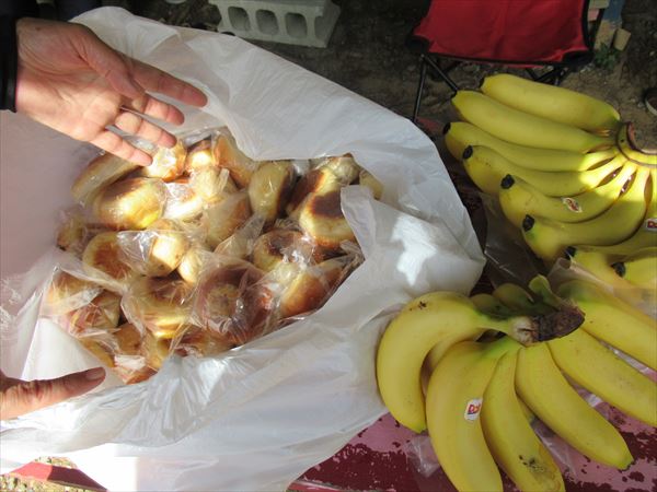 一回目の搬入が終わり、テントに戻ると差し入れが待っていた。毎週水曜日バナナとパンを届けてくださるのは、元衆議院議員の古堅実吉さん。