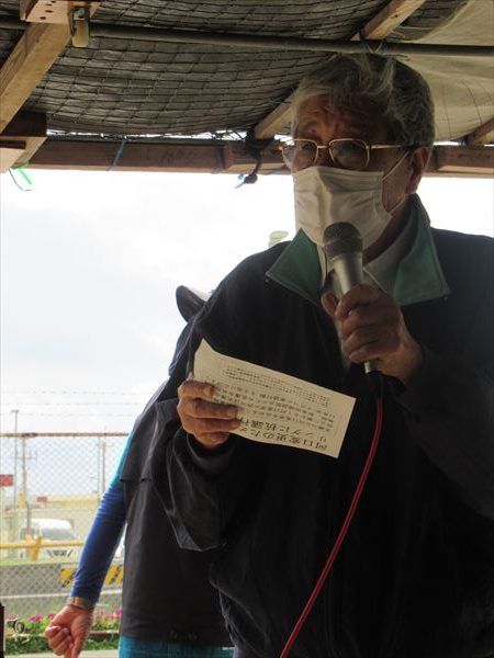 久々に大城敬人名護市議もゲート前に姿を見せた。心臓に持病を抱える大城さんはドクターストップがかかり、しばらく足が遠のいていたが、辺野古新基地建設の重大局面で名護市の対応が今後に大きな影響を与えるとして、近況報告に駆け付けた。