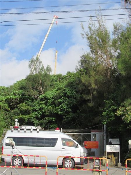 坐りこむと同時に気が付いたのは、真向かいの基地の中で動き出した重機。何やら工事が行われているらしい。条例で定められた名護市との協議を無視して、美謝川のボーリング調査が始まったとみられる。