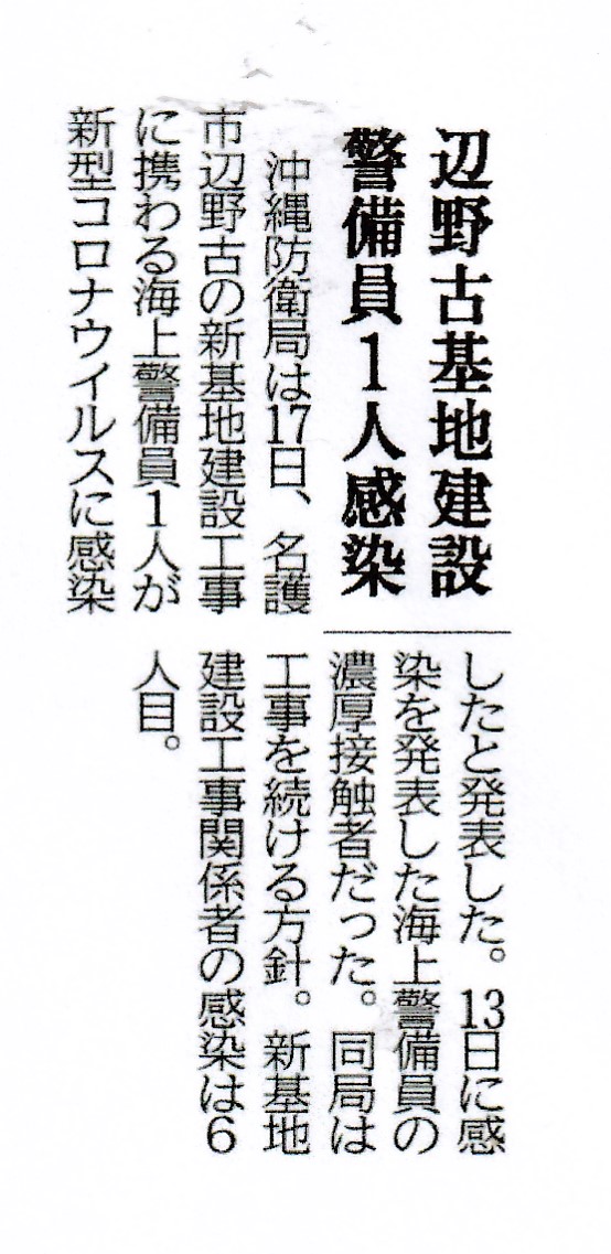 18日の琉球新報は、辺野古新基地工事関係者に6人目の感染者が出たと報じた。防衛局は、それでも工事は止めないという。