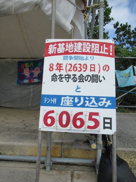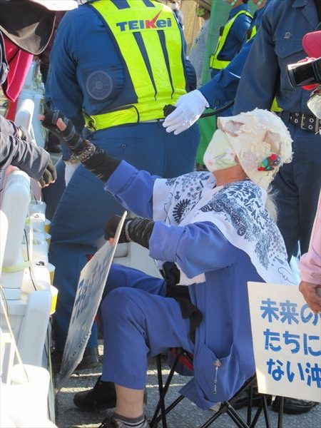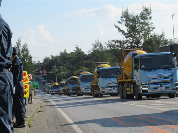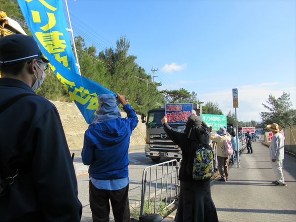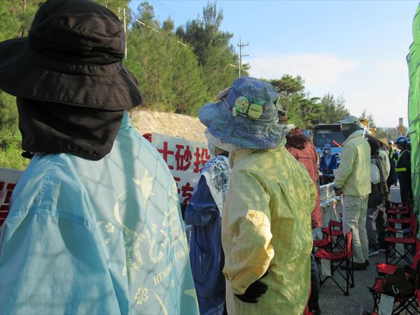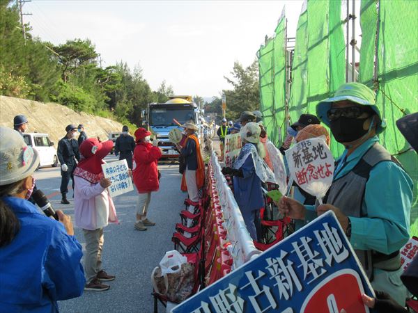 今日も(25日)は最大45人が座り込んだが、9時、12時、15時の3回にわたって232台の工事車両が基地の中に入った。