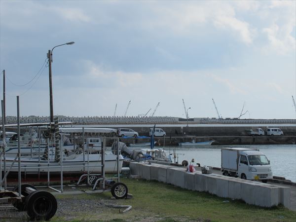 浜のテントからは、埋め立てが進む辺野古側の工事現場を遠く望むことができる。重機類がうごめく様子が見えた。