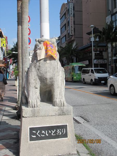 すっかりシャッター通りと化してしまった那覇のメインストリート国際通り。久茂地側の入り口に鎮座するシーサーさんも、ちょっと変わったマスクで感染予防をアピールしながら、コロナの一日も早い収束を願っています。