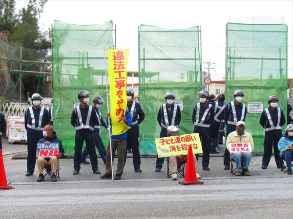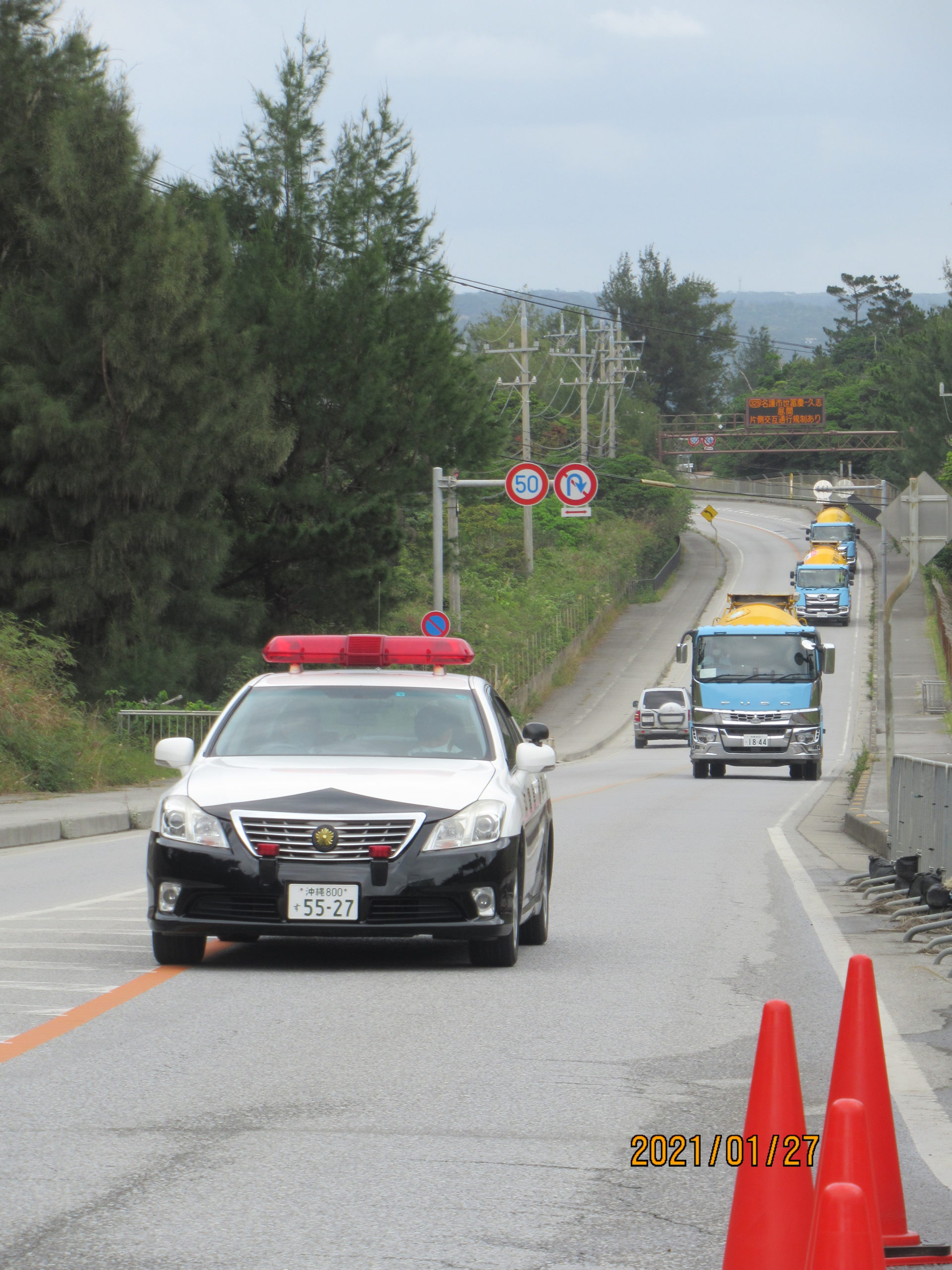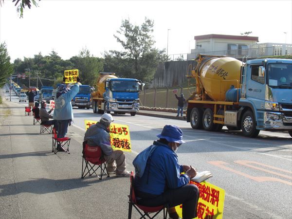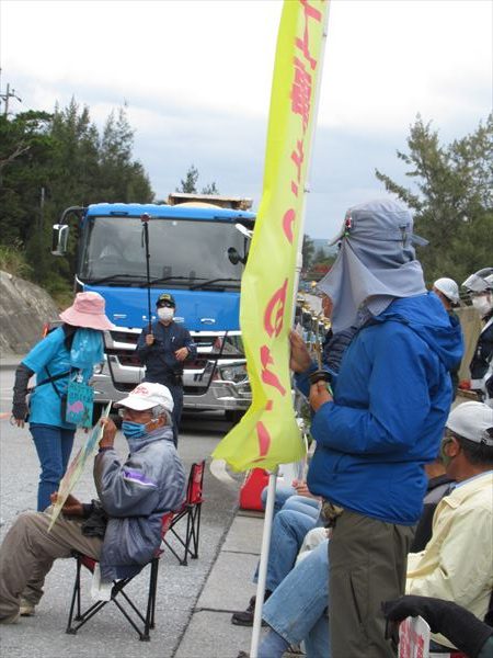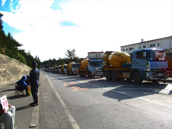 今日も列をなしてやってくる生コン車、埋め立て資材を運ぶダンプの様子が少し変わった。先週から先導してくる県警のパトカーの姿が見えなくなったのだ。県民の批判が多かったのでやめたのだろうか?