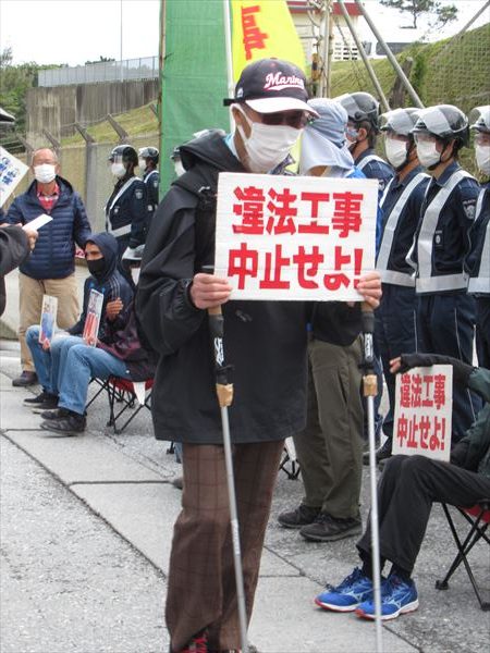 年に数回、東京から辺野古へ通うこの方は、両手に杖を突いても、みんなと一緒にゲート前を歩き続ける。