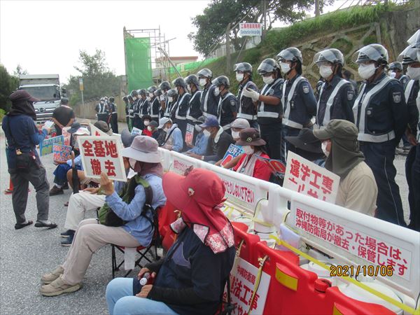 ところがやってきた機材搬入のダンプは10台にも満たず、10数分で一回目の抗議行動も終わった。この分では、先週のように午前中で終わるかもと期待して、機動隊の指揮官に聞いてみると「わからない」という。