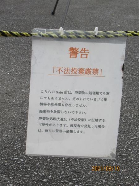 <写真③:宮城さんが指さしている張り紙。「ここは廃棄物処理場ではありません」と書いてある。「それはこちらのセリフでしょ!」と言いたくなる>