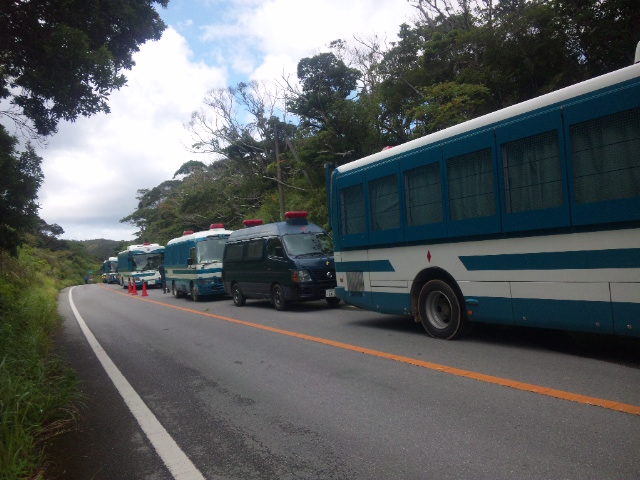 一本道、しかも一車線しかない住民の生活道路を、全国から派遣された500名もの機動隊の車両がふさぐ。