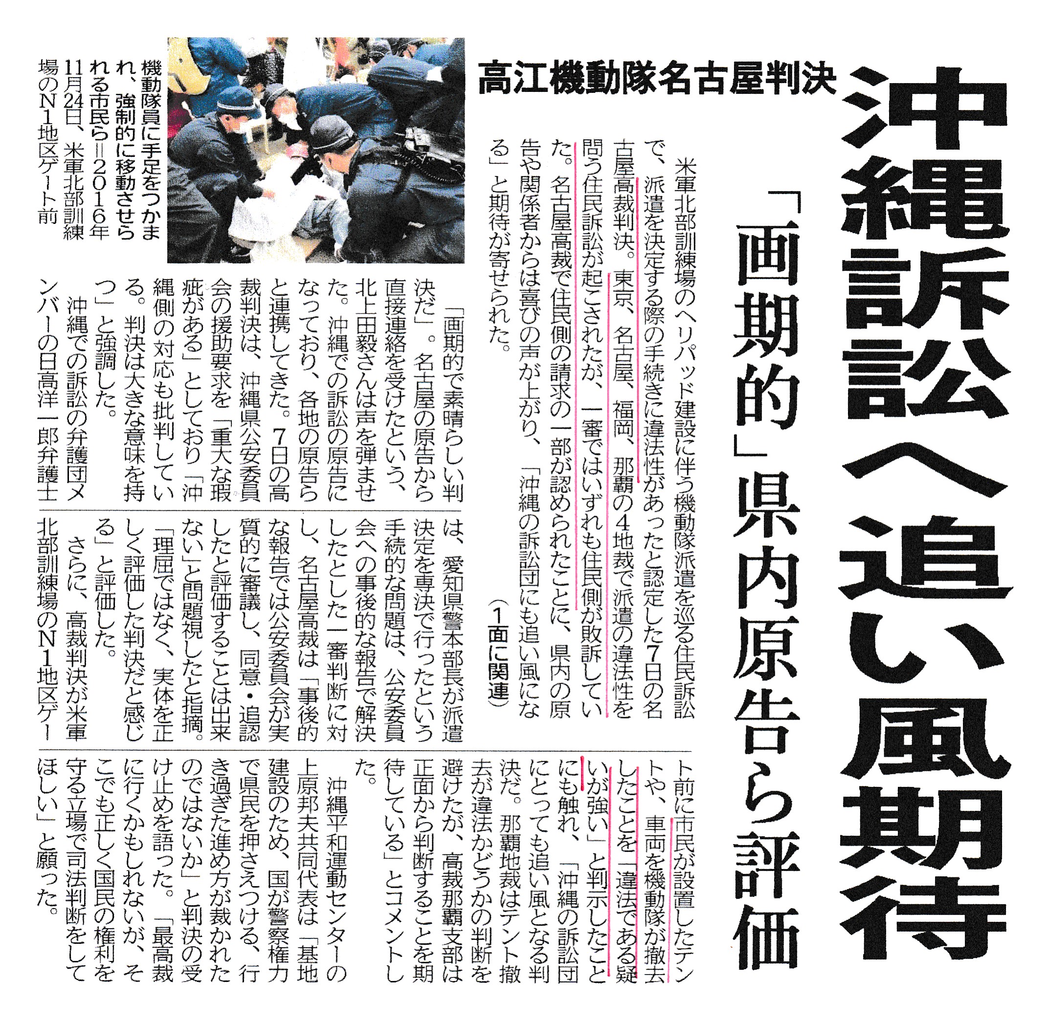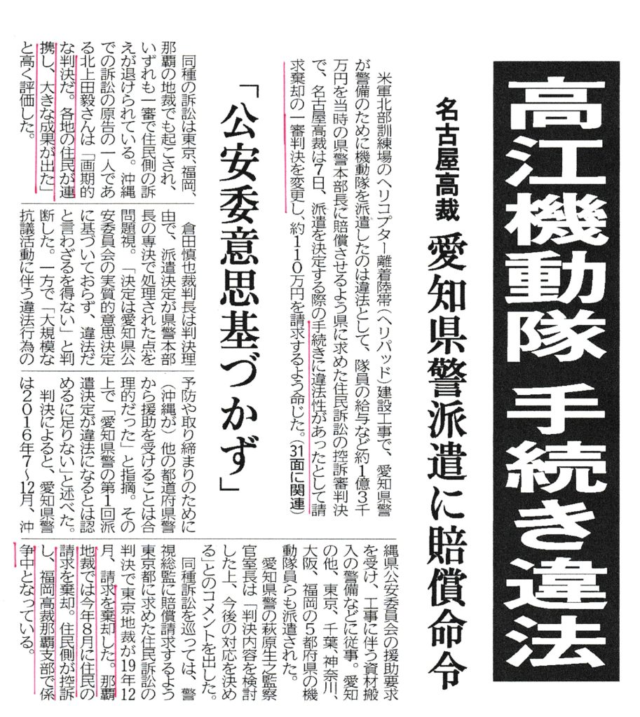 愛知の高江機動隊派遣住民訴訟で、名古屋高裁が一審判決を覆し、住民側が逆転勝訴したという。久々の嬉しいニュースに胸が高鳴った。