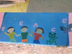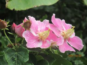 メインゲートの前にピンク色もさわやかに酔芙蓉の花。テント下のベンチに描かれた絵もかわいい。