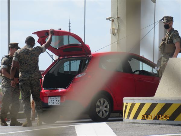 ゲートの中に入る車両チェック、いつもは 日本人の軍警が行っているが、今日は物々しく武装した米兵が車のトランクまで開けさせて点検していた。