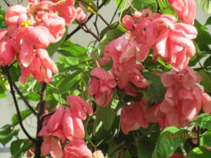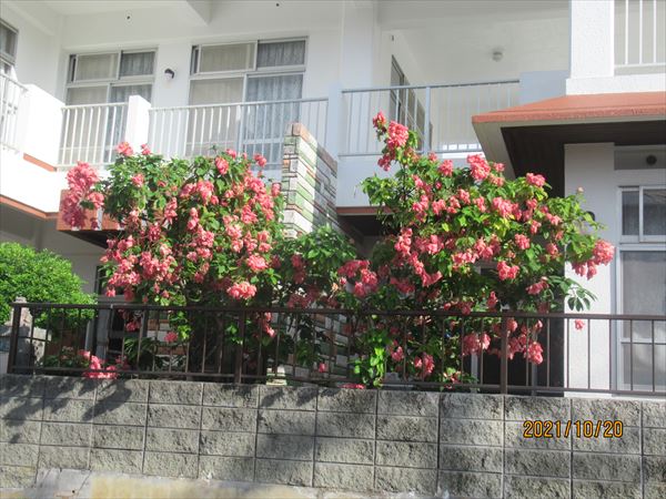 辺野古の集落で、去年はじめて見つけた赤い崑崙花、今年も華やかに咲いていた。