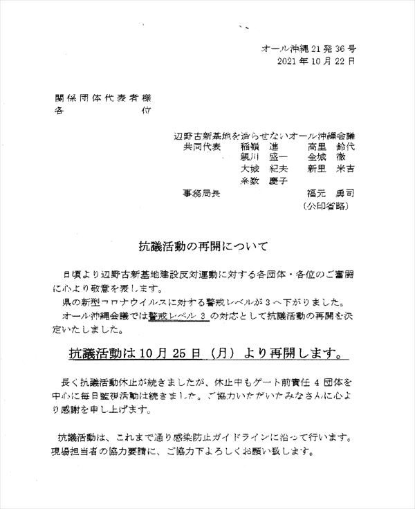 辺野古新基地を造らせないオール沖縄会議(通称:「オール沖縄会議」)は、コロナ禍で長い間辺野古現場での抗議活動を休止していたが、沖縄県の新型コロナウイルスに対する警戒レベルが「3」へ下がったとのことで、10月25日(月)から抗議行動を再開すると、傘下の各組織に通知を行った。