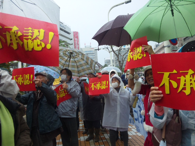 東京で、仲井間知事と総理が茶番劇を演じている同時刻、沖縄では、知事に選挙で公約した「不承認」を貫くよう訴えて、1.500名の市民が県庁を包囲した。