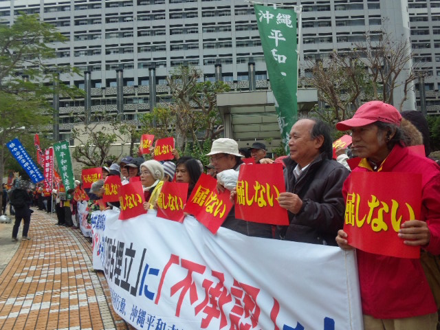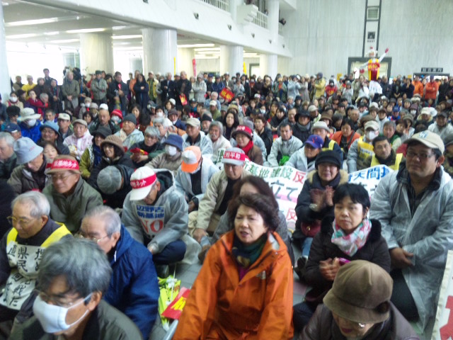 県庁ロビーを埋め尽くした1000人~ 仲井間知事の辺野古埋め立て容認に抗議して、 25日に続いて、今日も2000人が県庁を包囲した。 包囲行動終了後 県民に対する直接説明を求めて 1000人の市民・県民が、県庁ロビーを埋め尽くした。 この日、午後3時から容認発表の記者会見が、県庁内で行われる予定だったが、 県民の強い怒りに臆した仲井間知事は 登庁することができず、 知事公舎に閉じこもったまま、機動隊に守られて、 予定していた記者会見を行い、「辺野古埋め立て容認」を発表した。 沖縄~平和のメッセージ 2013年12月27日unaiリンクURL この記事を共有する → Tweet Pin It