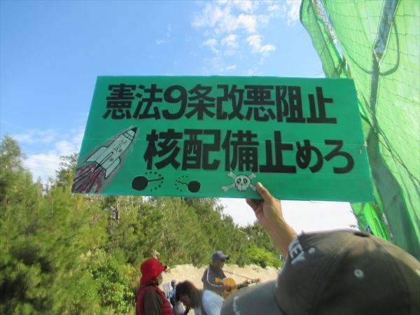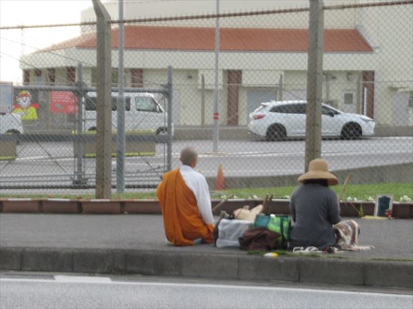 8時過ぎ辺野古へ到着すると、メインゲート前で、仏教徒の方々が、団扇太鼓を叩きながら祈っていた。私たちが休息しているときも、お昼を食べているときも、13:30に帰るそのときも、平和への祈りは、まだ続いていた。5時間以上だ。頭が下がる。