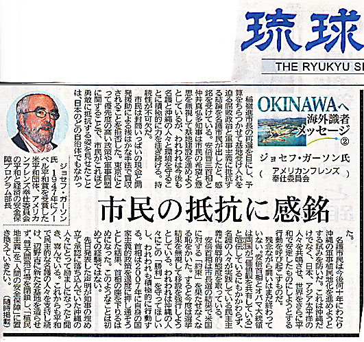 海外の著名な学者・文化人29人が賛同した声明を発表(右の新聞記事を参照)したことがきっかけです。 日本、沖縄、世界のメディアでも広く報道され、大きな反響を呼び起こしました。
