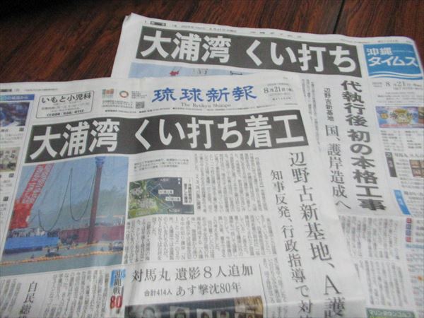今朝の地元2紙朝刊。防衛局は昨日(20日)、沖縄県との事前協議に応えず無視したまま、いくつもの違法行為を重ね、大浦湾の軟弱地盤に杭打ちを開始した。