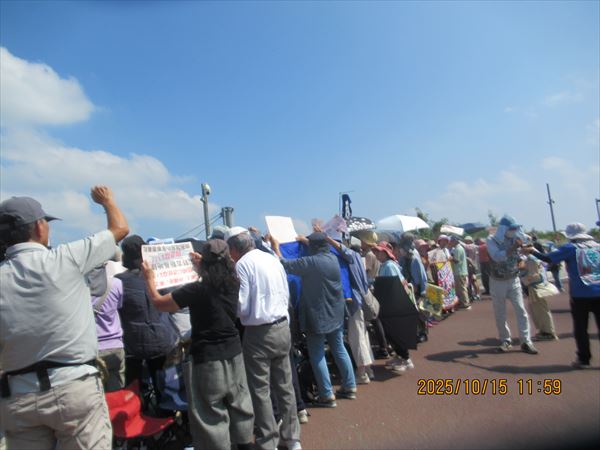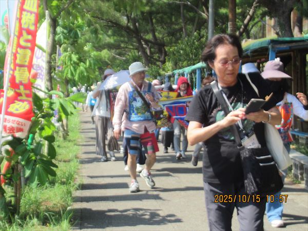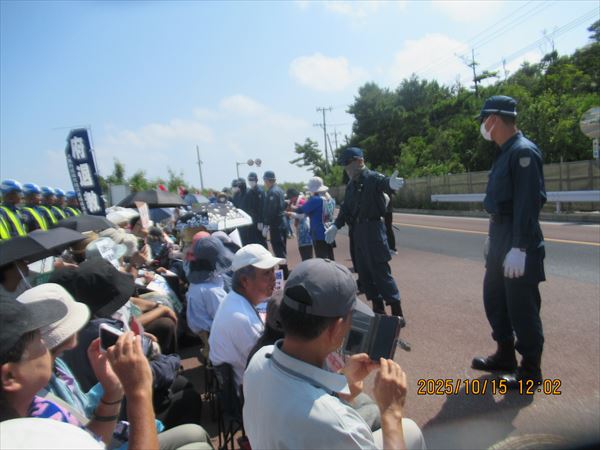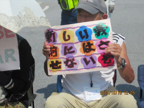 「府退教」の皆さんは、2年に一度沖縄へと長年の活動を続けている。一昨年は宮古島へ行ったので、辺野古へは4年ぶりとのこと。「沖縄の闘いは日本だけでなく、世界の平和にとっても重要な闘い、共に頑張ります」と。