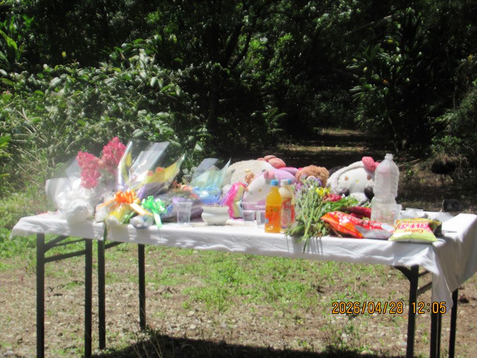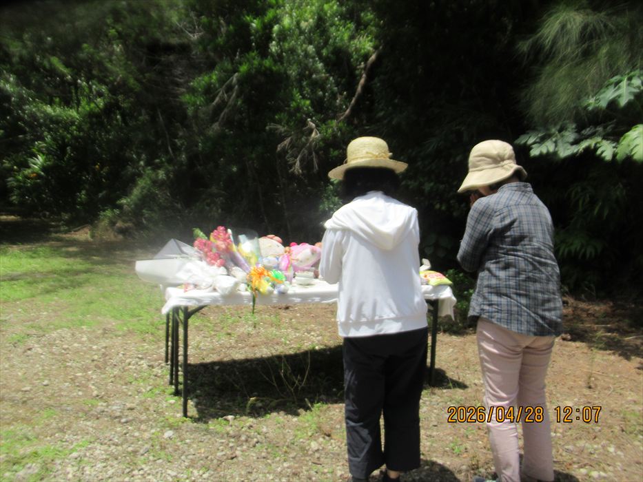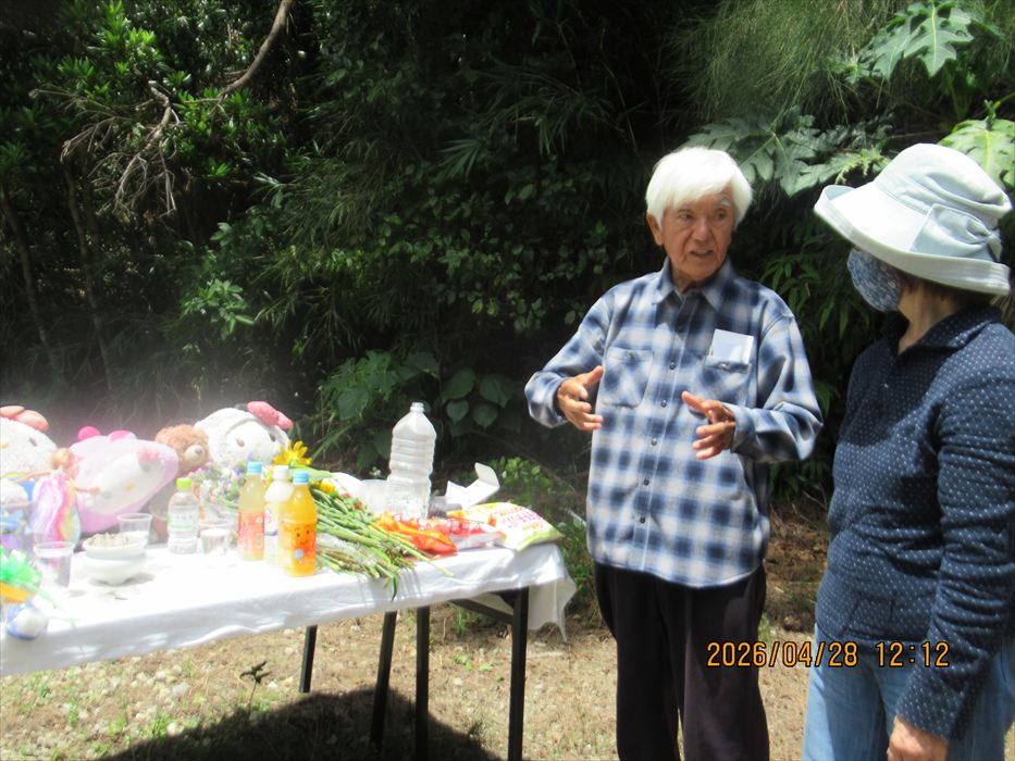 この10年間、現場周辺の草刈りや供え物の清掃管理などを担う元金武町長の吉田勝廣さん。今年も前日から献花台を備え、訪れる人たちに対応してくださっていた。